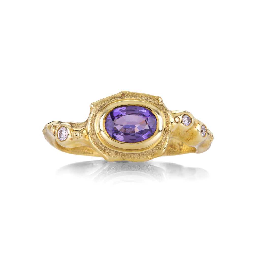 Passionate purple takes center stage in this 18k yellow gold ring from Audrius Krulis. A faceted 0.65ct purple sapphire is set in an organically shaped textured bezel, with three white diamonds totaling 0.05cttw along the band. The freeform band width measures 2.6mm. Size 5.75. Handcrafted in Montrose, NY, U.S.