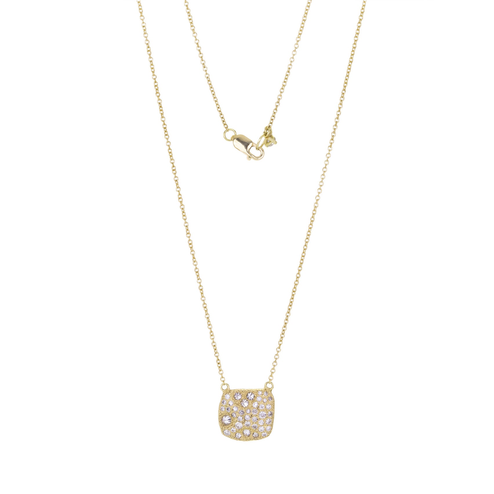 An 18k yellow gold chain with an 11mm x 12mm squarish pendant set with inverted white diamonds totaling 0.80ct. Total length measures 18". Handcrafted in Cleveland, OH, U.S.