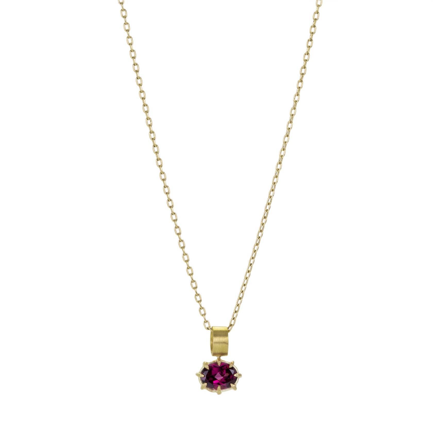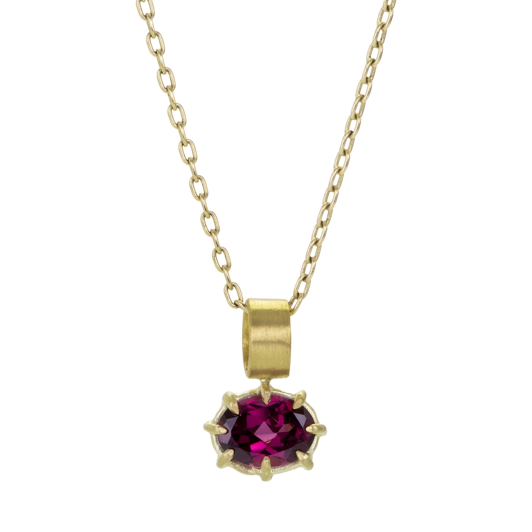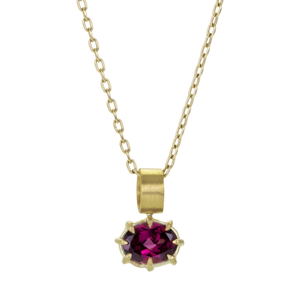 This 18k yellow gold pendant from Rosanne Pugliese is fresh and effervescent in deep, sparkly pink. A mini faceted oval garnet is set east-west in pointed prongs with a wide 22k yellow gold brushed bail. Total length measures 1/2" including bail. Pendant only, chain is sold separately. Handcrafted in Brooklyn, NY, U.S.