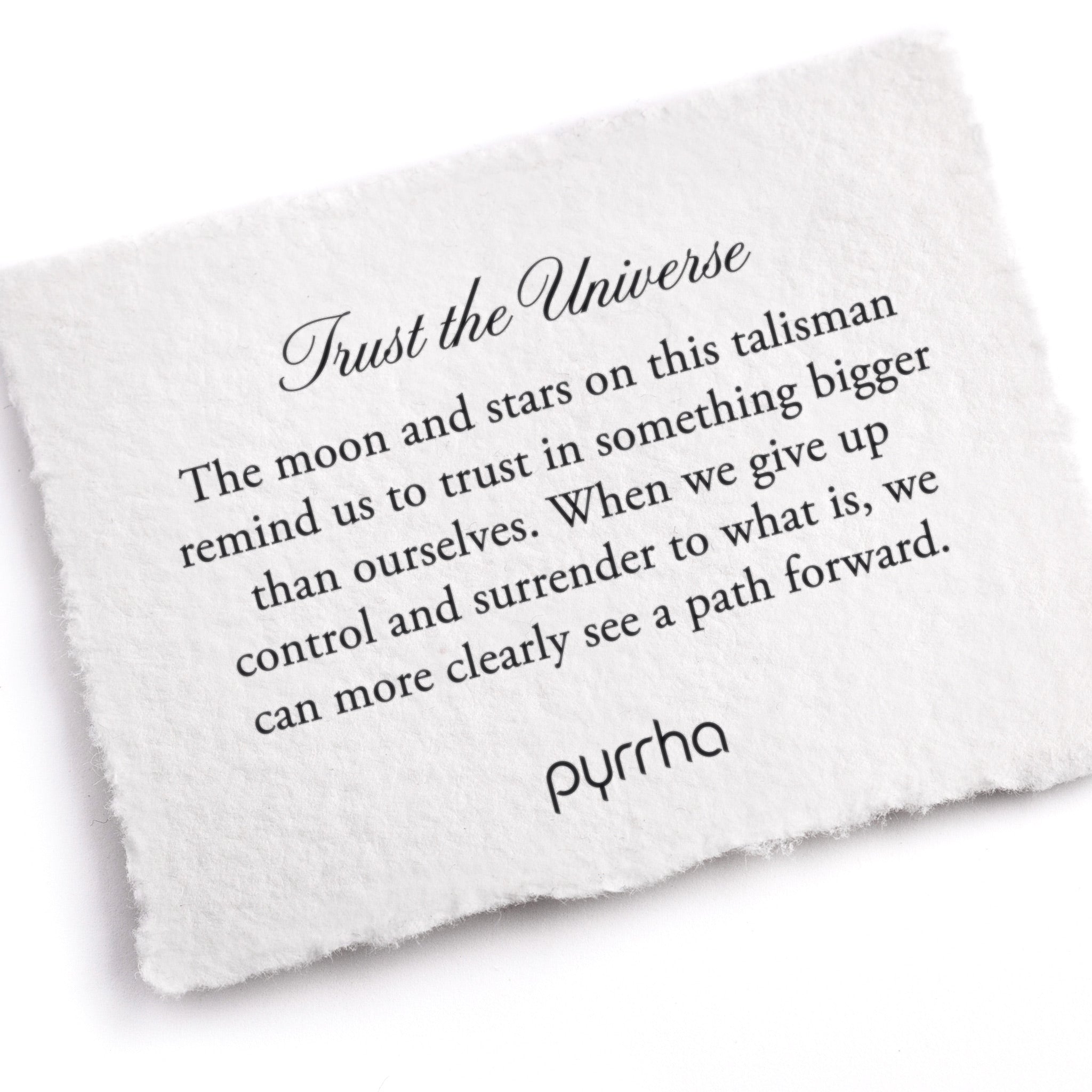 The moon and stars on this Pyrrha talisman remind us to trust in something bigger than ourselves. When we give up control and surrender to what is, we can more clearly see a path forward. Lovingly and sustainably cast in recycled sterling silver and 14k yellow gold with black contrast, this potent talisman hangs on a 22” darkened sterling silver chain with lobster clasp. Pendant length measures 1” including bail. Handcrafted in Vancouver, Canada.