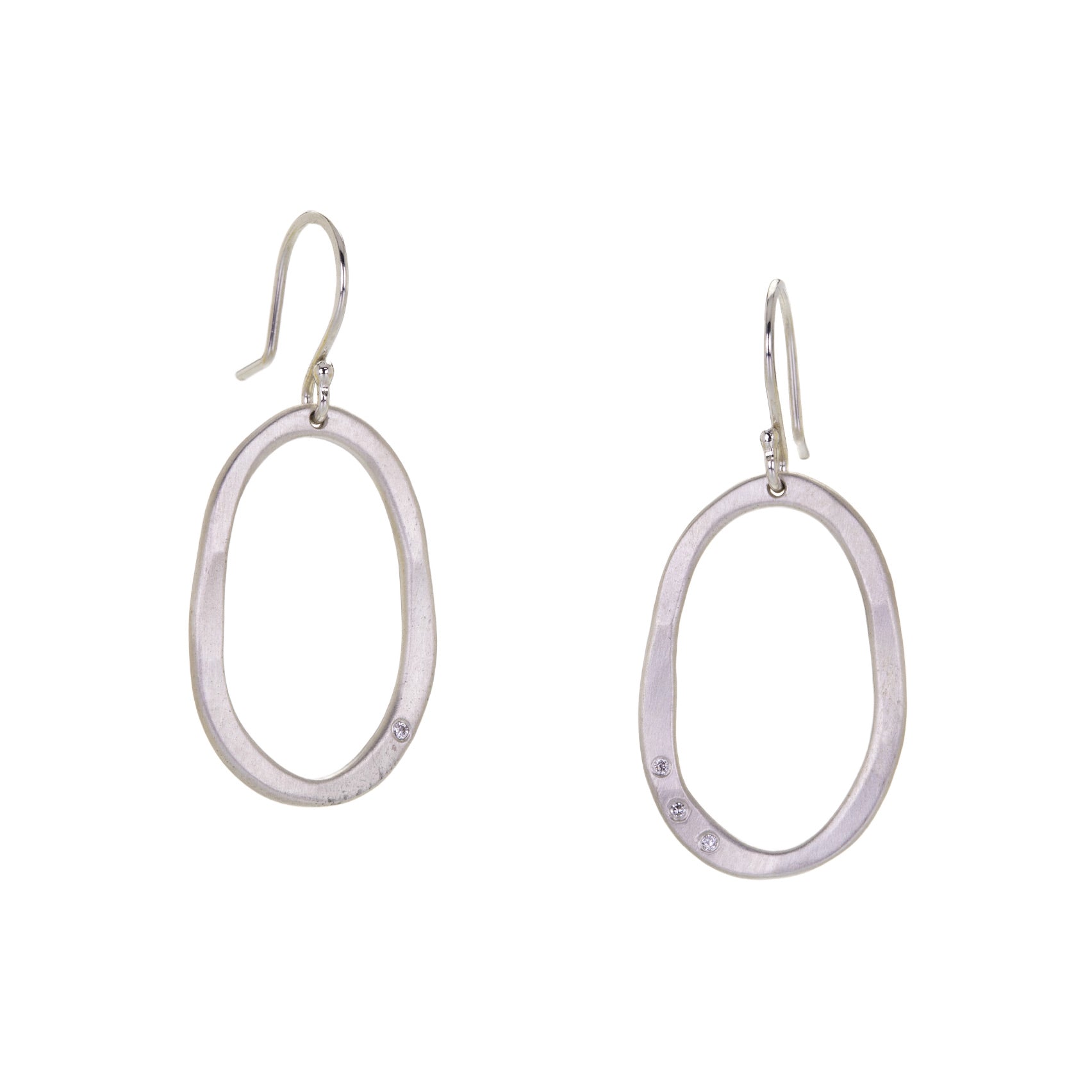 Let a quiet moment of peace wash over you in this pair of sterling silver drop earrings from Sarah McGuire. Open organic hammered ovals feature scattered surface set diamonds that sparkle like sunlight. Total length with curved ear wires measures 1 1/8". Handcrafted in Chicago, IL, U.S.