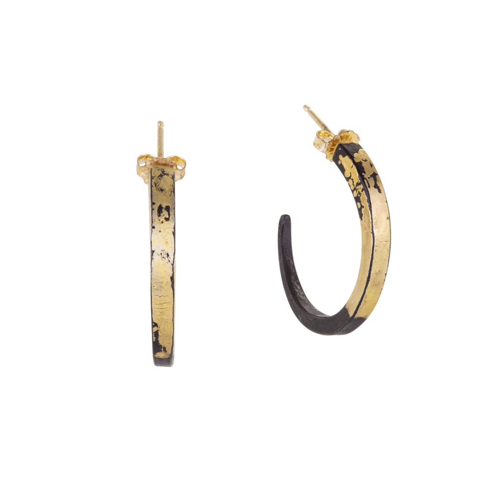 An elegant and simple design, this pair of hand forged iron hoops from Pat Flynn are a distinctive variation from the norm. With an 18k yellow gold post, and 22k gold dust fused to the surface, picture yourself in these stylish black and gold beauties. Outer diameter measures 1 1/8". Handcrafted in High Falls, NY, U.S.