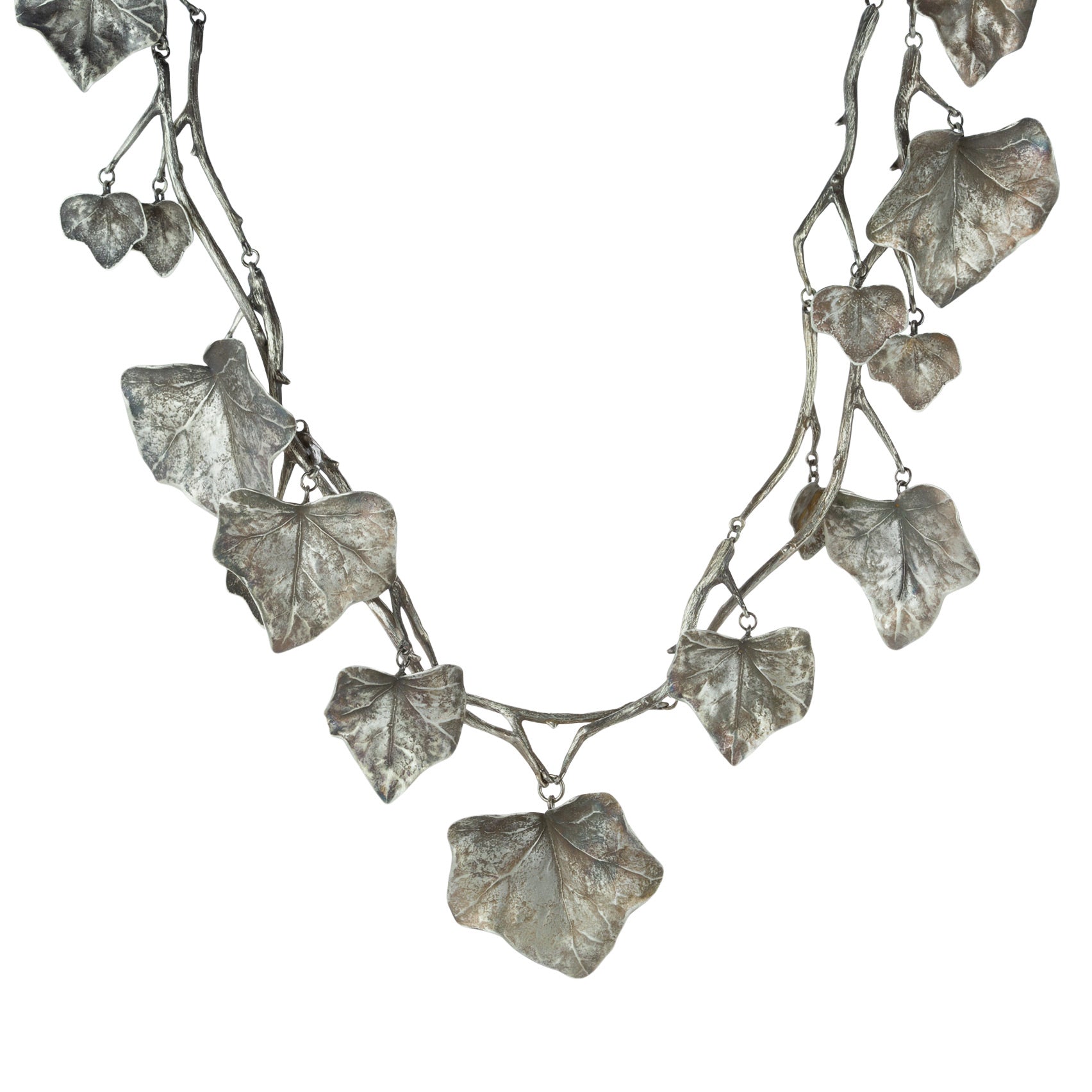The delicate precision of this Gabriella Kiss necklace reveals the awesome beauty of nature's nuances. Two vines of ivy leaves are meticulously crafted in sterling silver and feature a warm patina that casts a beautifully rich glow. A true statement necklace for the forest lover in you. Total length measures 18". Handcrafted in Hudson Valley, NY, U.S.