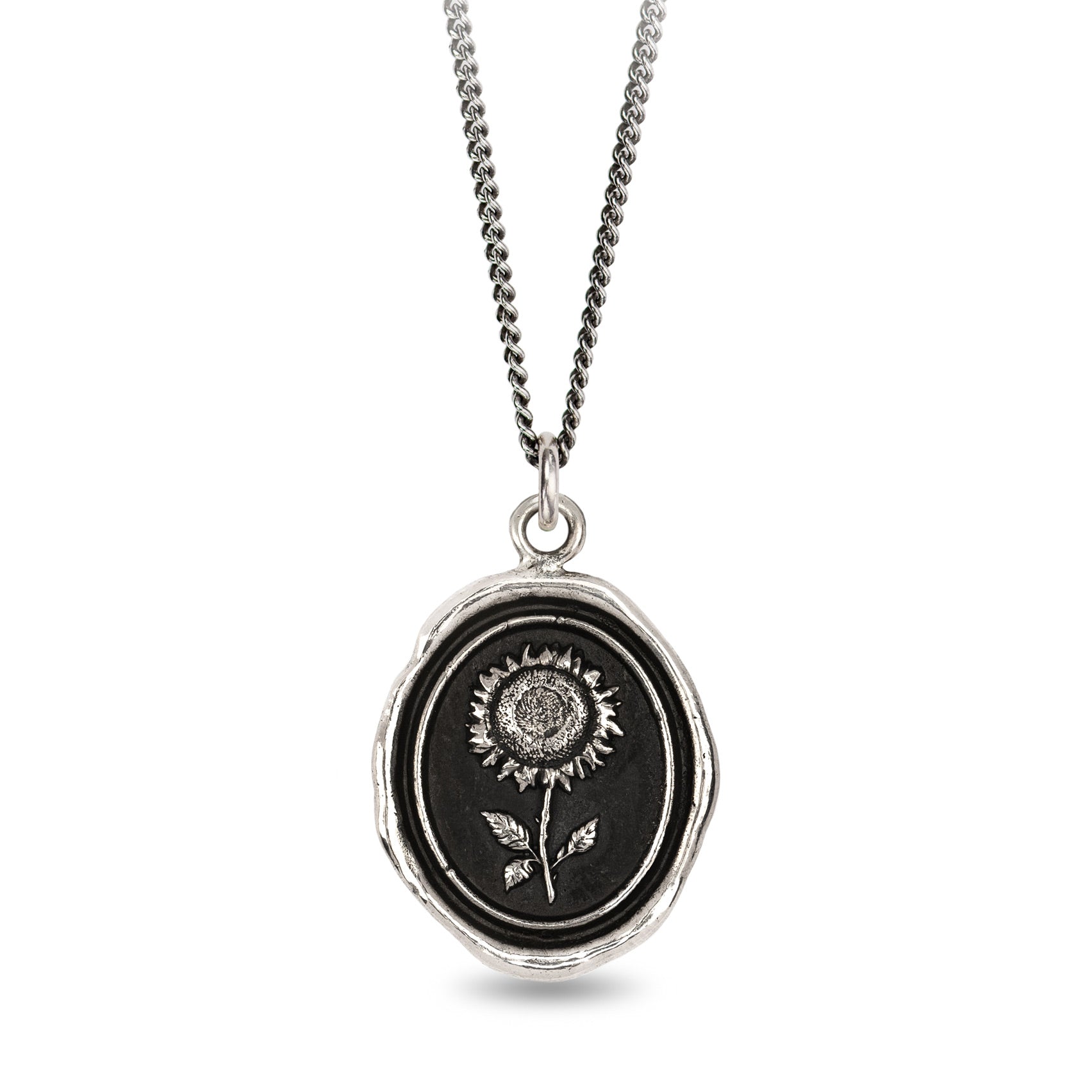 A symbol of radiant optimism, the sunflower in this Pyrrha pendant always reaches towards the light. It serves as a reminder to hold your head high, seek joy in the everyday, and stay rooted in what brings you happiness. Lovingly and sustainably cast in sterling silver, this potent talisman hangs on an 18" fine chain with lobster clasp. Consider adding a Pyrrha attraction charm to this piece for an extra layer of color and meaning. Handcrafted in Vancouver, Canada.