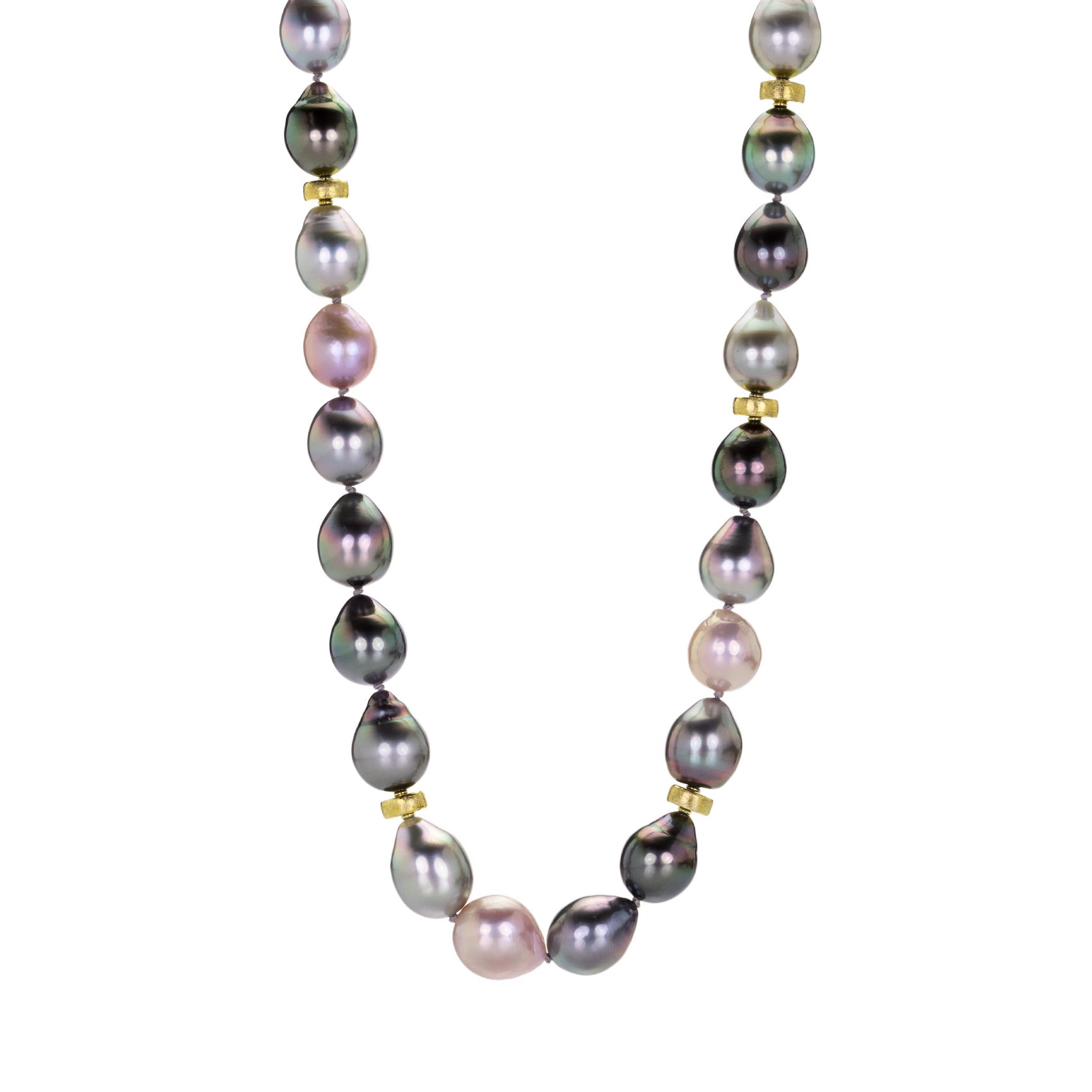 Dark and mysterious with a hint of soft color, this 18k yellow gold necklace from Barbara Heinrich features 8.8mm-13mm Tahitian pearls and five pink Chinese freshwater pearls, hand knotted on silk. 18k yellow gold spacers and a toggle clasp with diamonds totaling 0.03cttw add a dash of sparkle and golden glow. Total length measures 18 1/2”. Handcrafted in Rochester, NY, U.S.