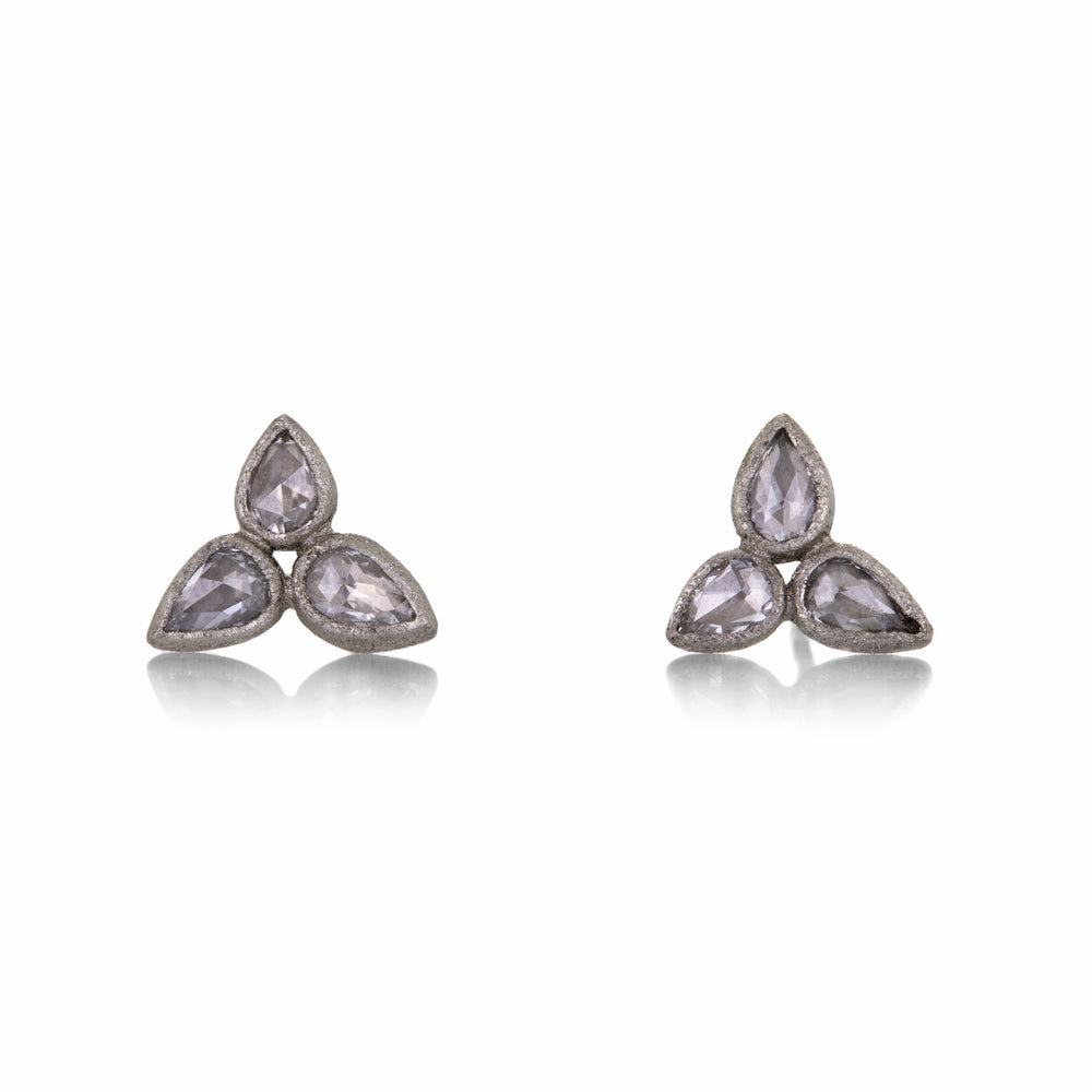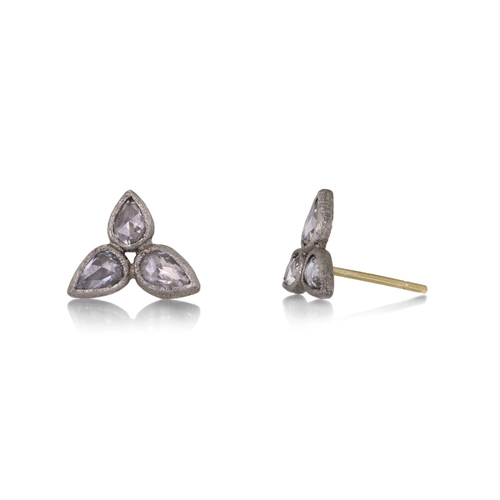 A pair of 14k white gold studs, each with 3 pear shaped, rose cut diamonds and 18k yellow gold posts & backs. Studs measure 3/8" in diameter. Handcrafted in Cleveland, OH, U.S.