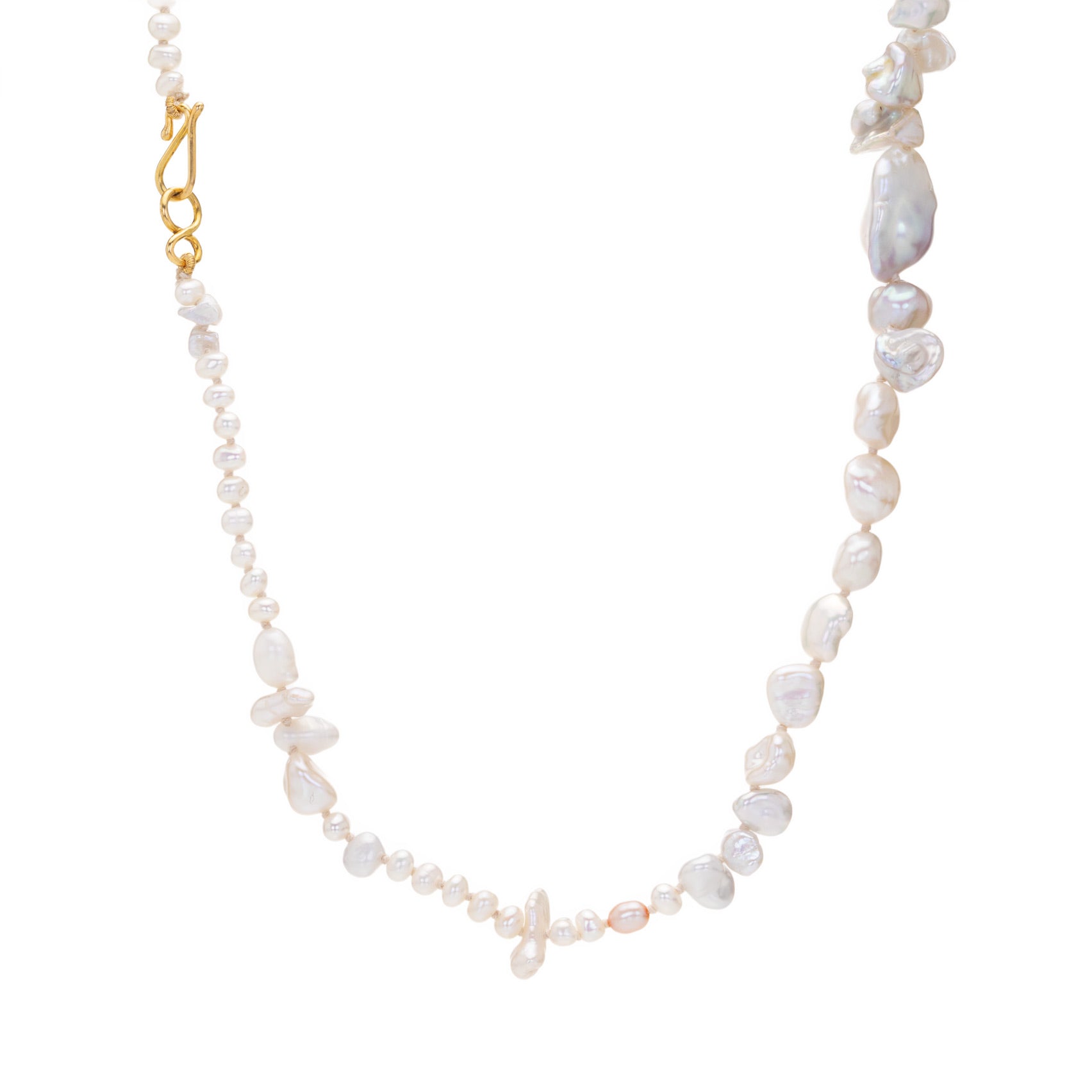 A treasure from the sea to behold, this shimmering necklace from Lena Skadegard has a light all its own. White and gray Japanese pearls are thoughtfully arranged and hand knotted for a luxurious drape. Total length with a 9k yellow gold hook & eye clasp measures 20”. Handcrafted in Denmark.