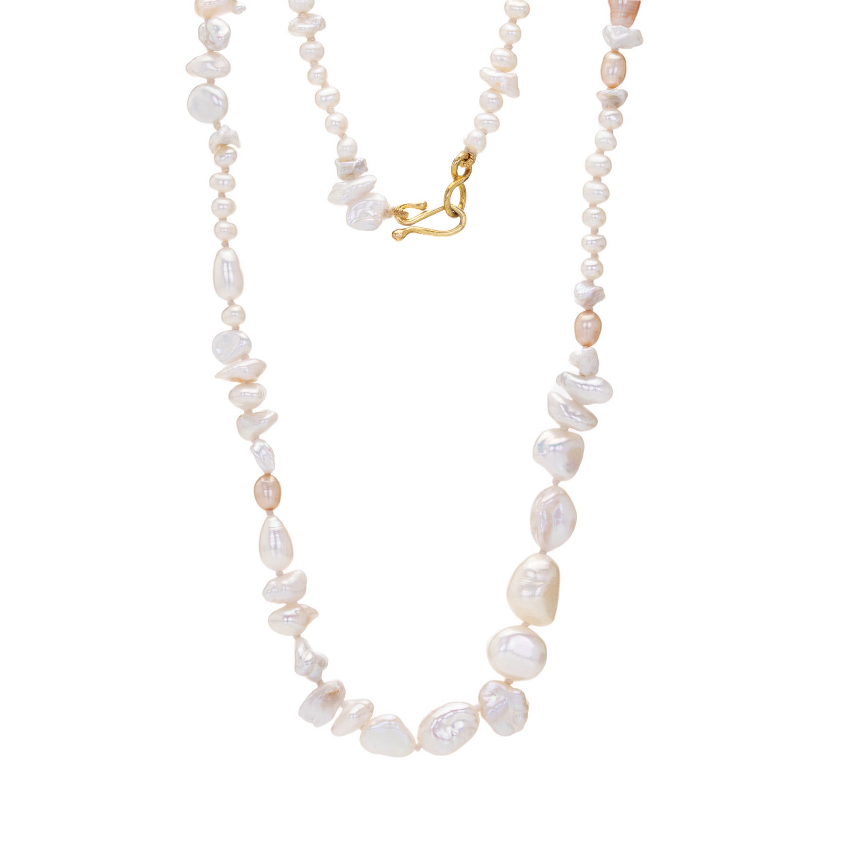 A treasure from the sea to behold, this shimmering necklace from Lena Skadegard has a light all its own. White Japanese pearls are thoughtfully arranged and hand knotted for a luxurious drape. Total length with a 9k yellow gold hook & eye clasp measures 20”. Handcrafted in Denmark.