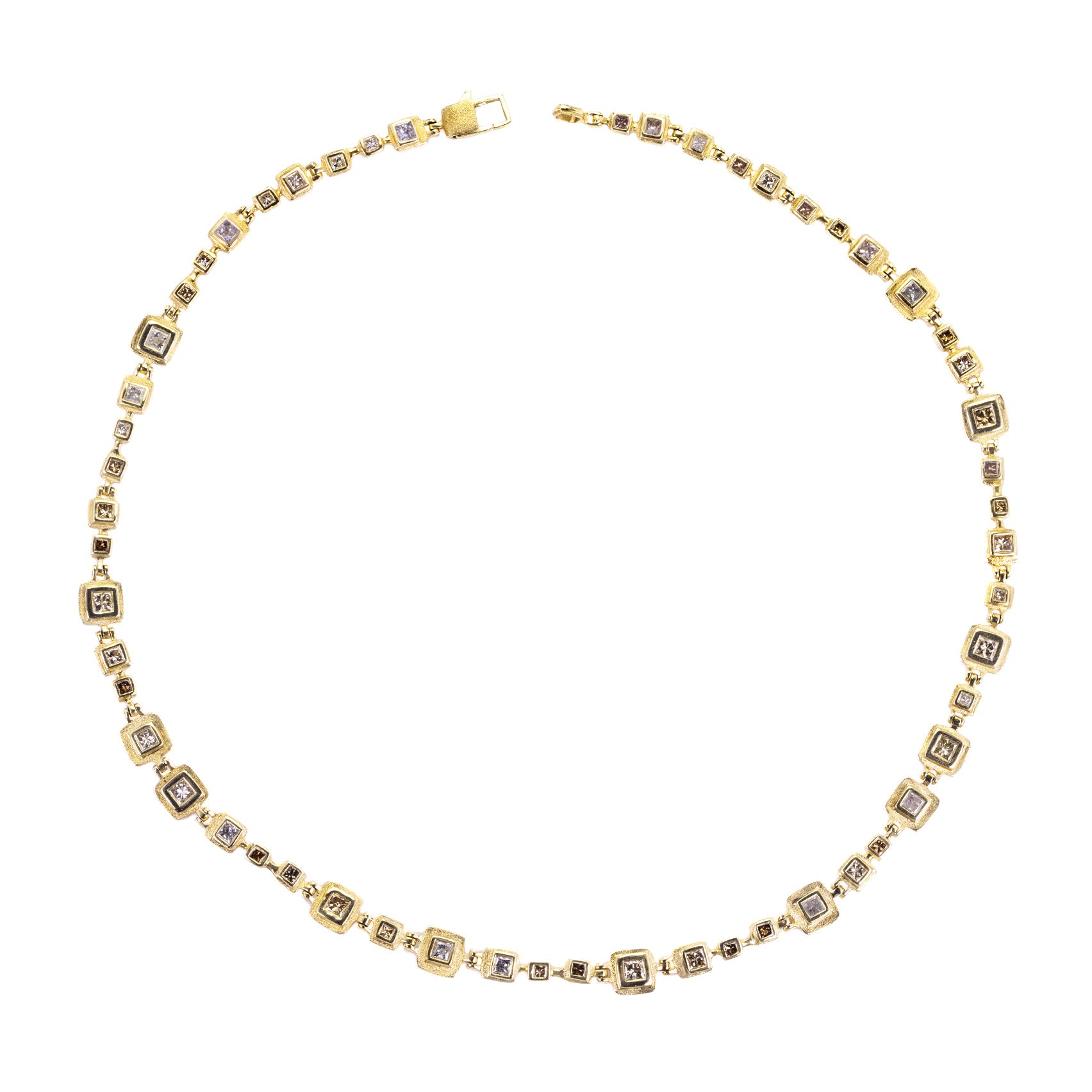 Add a layer of modern artistry to your look in this exquisitely crafted 18k yellow gold necklace from Audrius Krulis. An endless parade of princess cut champagne diamonds comprise every link, set in lavishly textured bezels. Total length measures 17 1/2” with square lobster clasp. Handcrafted in Montrose, NY, U.S.