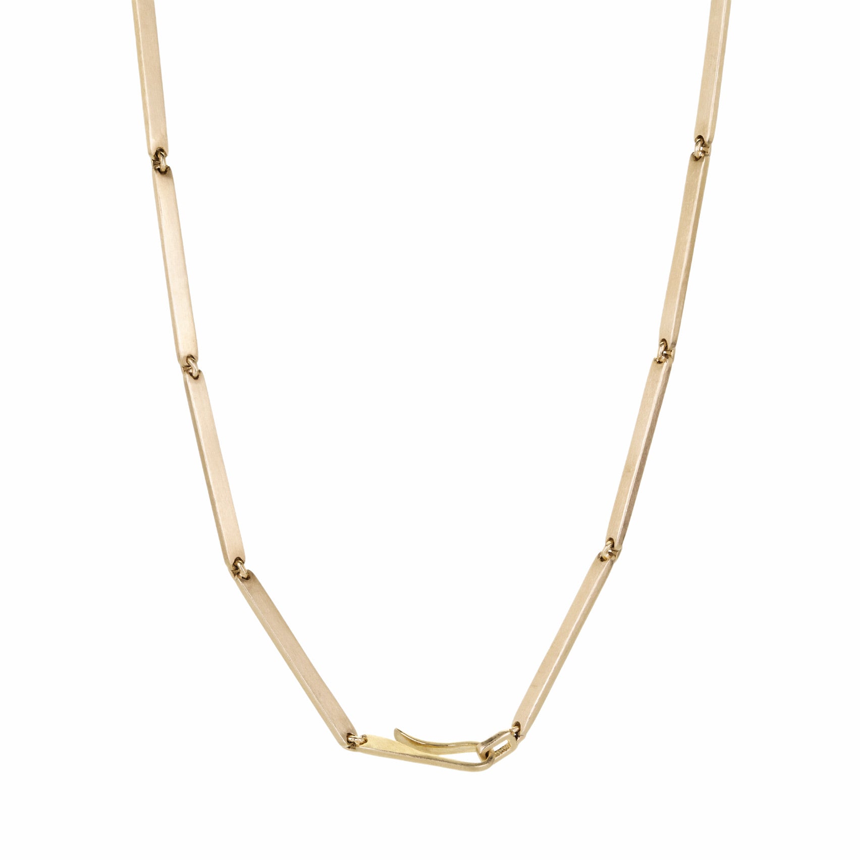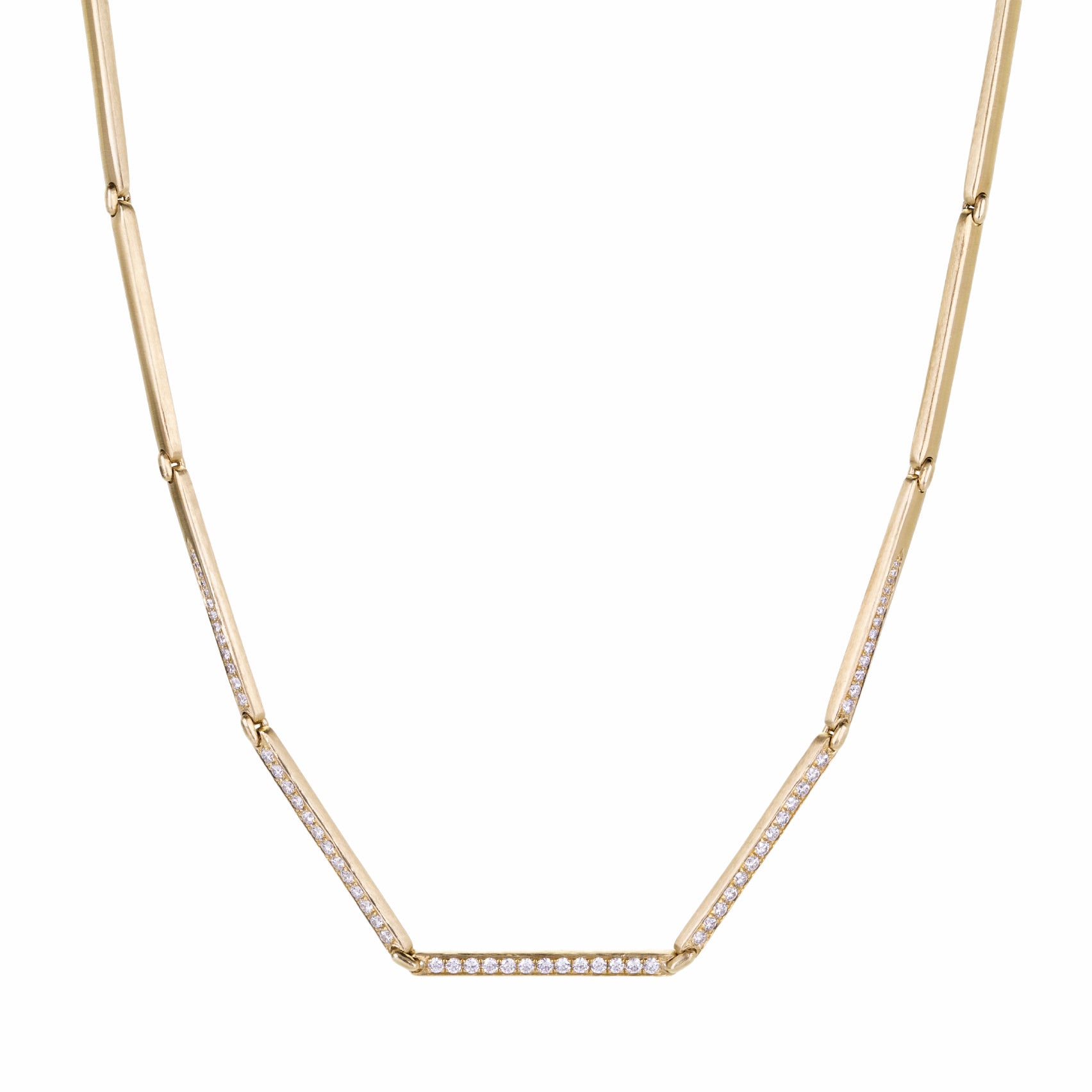 Fiery lines of diamonds march along in this 14k yellow gold bar necklace from Nicole Landaw. The F-G, VS white diamonds totaling 0.75cttw put on a show whether layered into your stack or worn solo. Total length measures 18” with a simple hook clasp. Handcrafted in Hudson River Valley, NY, U.S.
