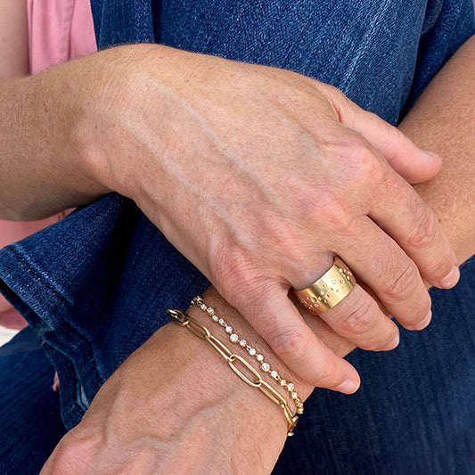 If you’ve ever wished for a river to skate away on, consider it granted! This 14k yellow gold bracelet from Nicole Landaw features bend after bend of white faceted diamonds totaling 1.40cttw. Total length measures 7 5/8” with a locking hook and eye clasp. Handcrafted in Hudson River Valley, NY, U.S.