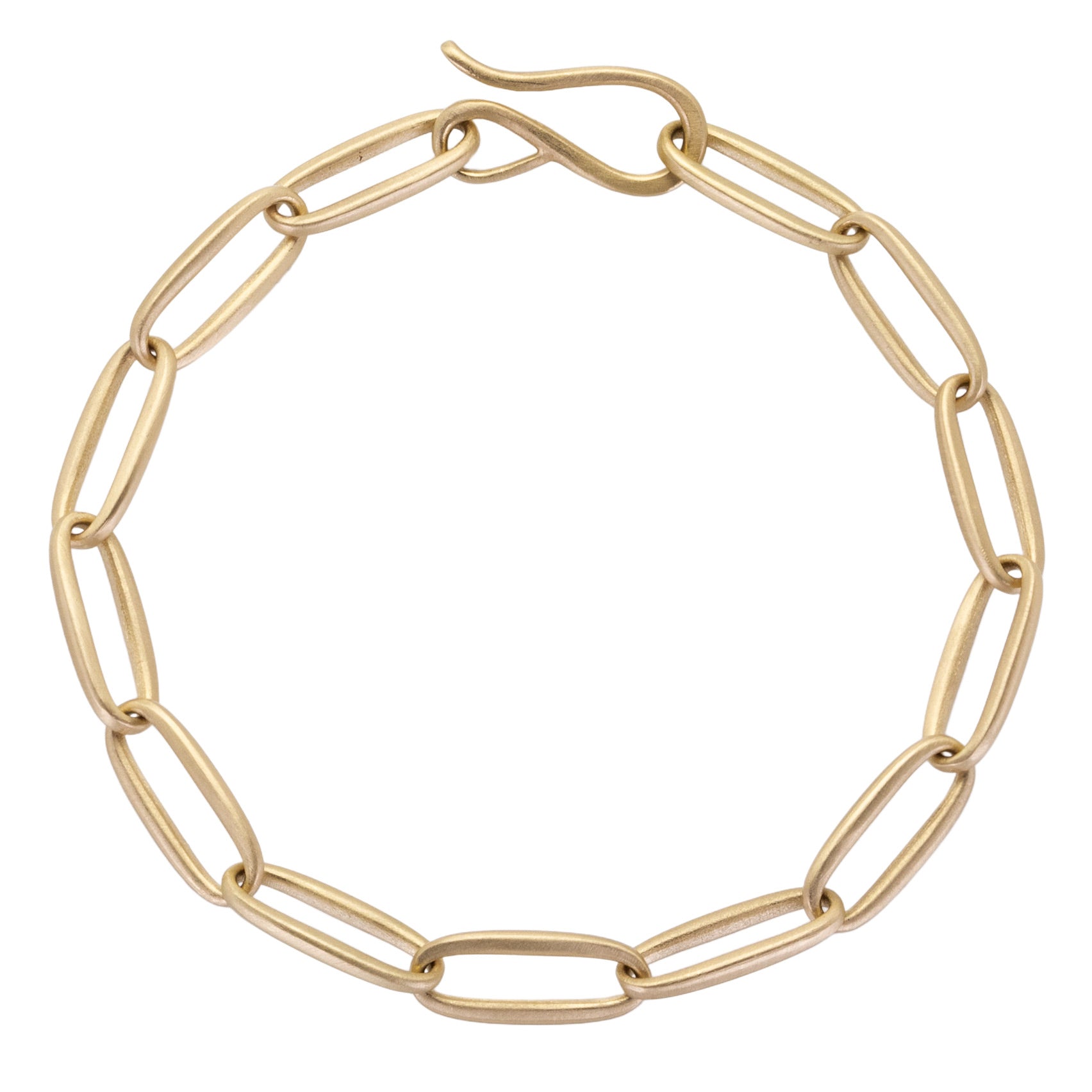 Lovely for layering up your wrist stack, this brushed 14k yellow gold link chain bracelet from Nicole Landaw can confidently stand alone as well. Bring a delectable dose of golden glow to your daily routine! Total length measures 7 1/4” with a hook clasp. Handcrafted in Brooklyn, NY, U.S.