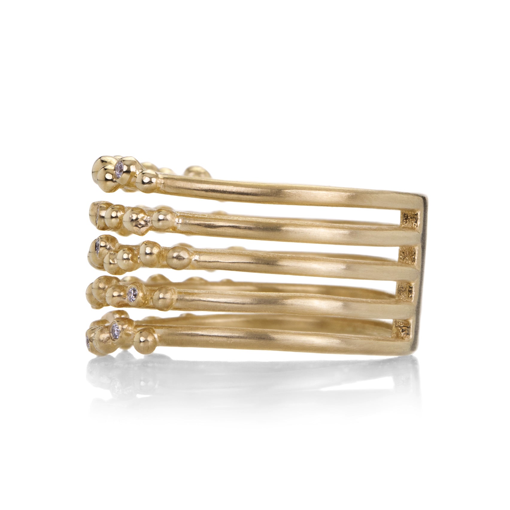 Dress your hand in layers of beaded diamond bliss in this 14k yellow gold ring from Nicole Landaw! White diamonds totaling 0.13cttw twinkle and chime in a chorus of organic form. Size 7.25. Handcrafted in Hudson River Valley, NY, U.S.
