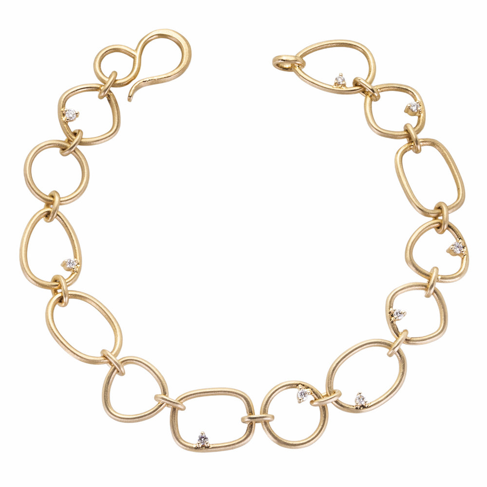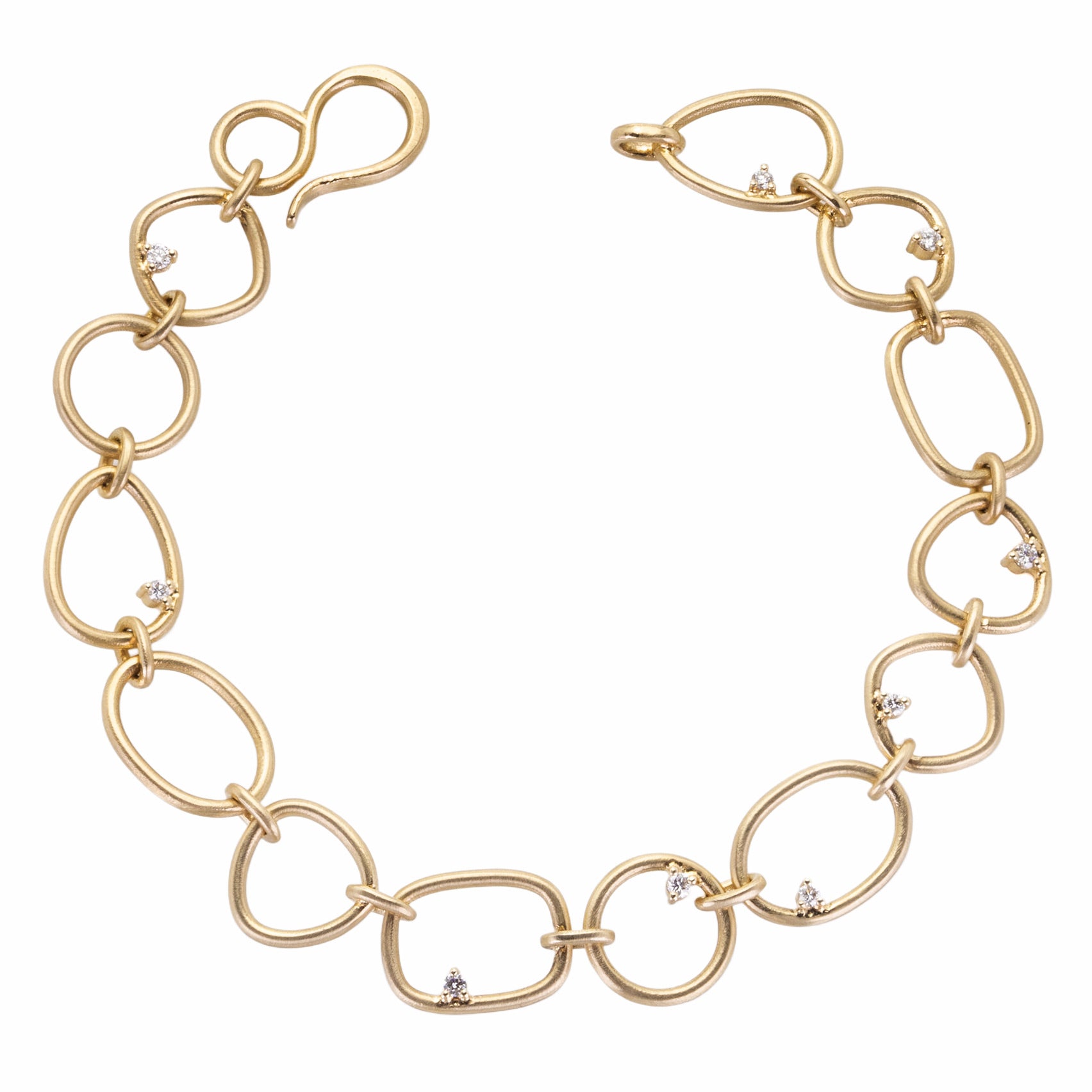 Swathe your wrist in organic luxury with this 14k yellow gold bracelet from Nicole Landaw. Thirteen freeform links of gold, some with sparkling white diamonds totaling 0.07cttw, connect to form an airy, yet unbreakable bond. Total length with elegant hook clasp measures 7". Handcrafted in Hudson River Valley, NY, U.S.