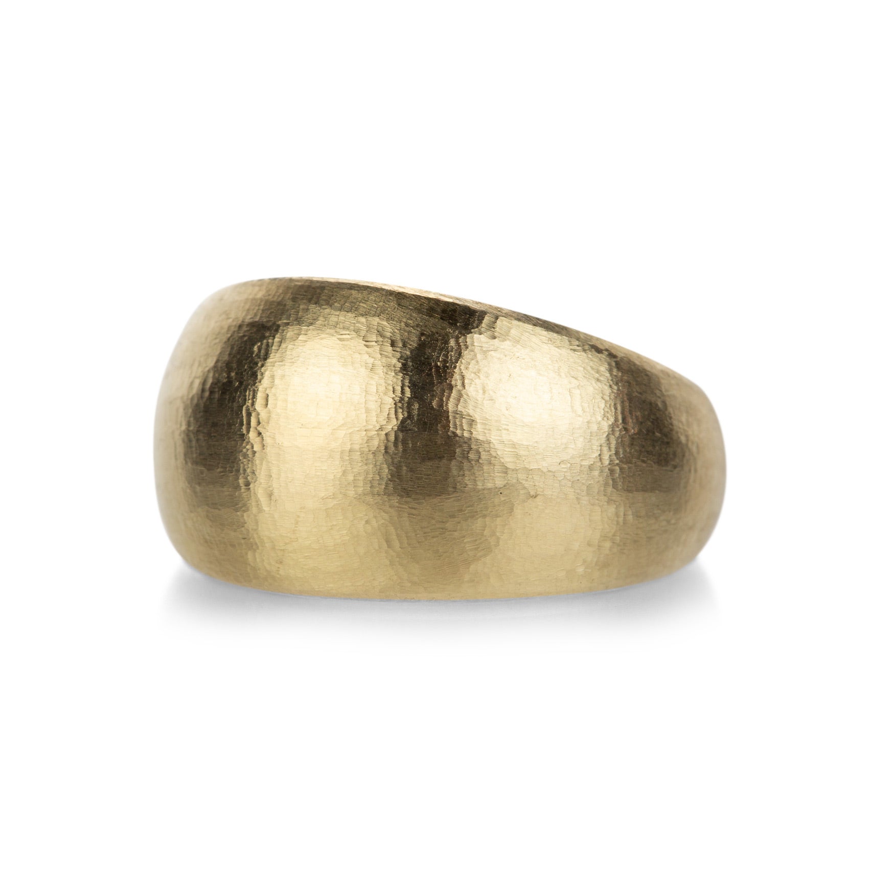 A statement of bold minimalism, this sensuously chic 14k yellow gold XL hewn band from Nicole Landaw begs to be touched. With luxurious texture and glow, the gently tapering profile continues seamlessly from 11.3mm in the front to 3.7mm in the back of the band. Size 5.75. Handcrafted in Hudson River Valley, NY, U.S.