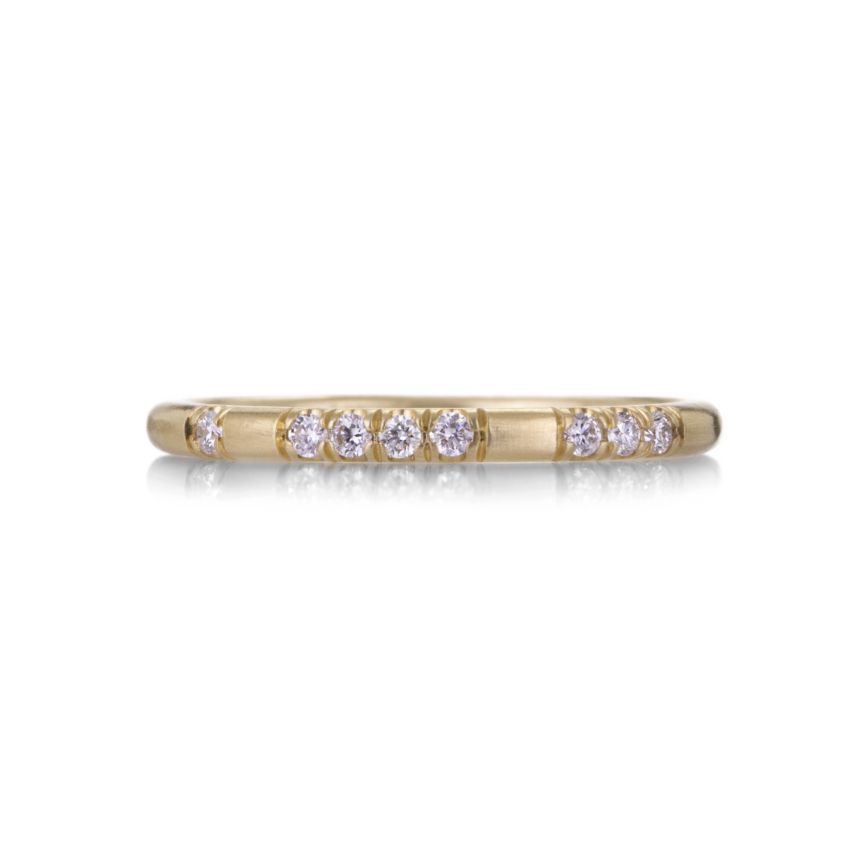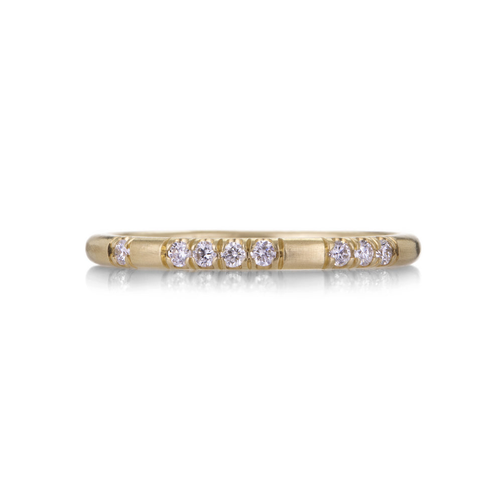 Say “I Love You” in a subtle, mysterious way! This 14k yellow gold heavyweight band from Nicole Landaw features eight diamonds totaling 0.12cttw. Read them as 1-4-3 for the heartfelt message meant just for you! Size 6.5. Handcrafted in Brooklyn, NY, U.S.