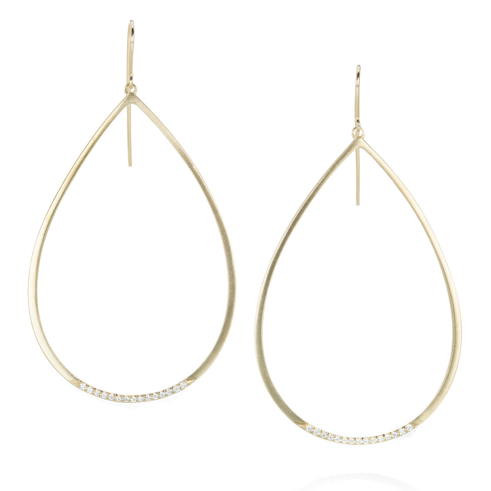 Go bold and go gold in this pair of 14k yellow gold open teardrop earrings from Nicole Landaw. Featuring pavé white diamonds totaling 0.33cttw for that perfectly sparkling dip, these drops will raise some brows! Total length with curved ear wires measures 2 5/8”. Handcrafted in Hudson River Valley, NY, U.S.