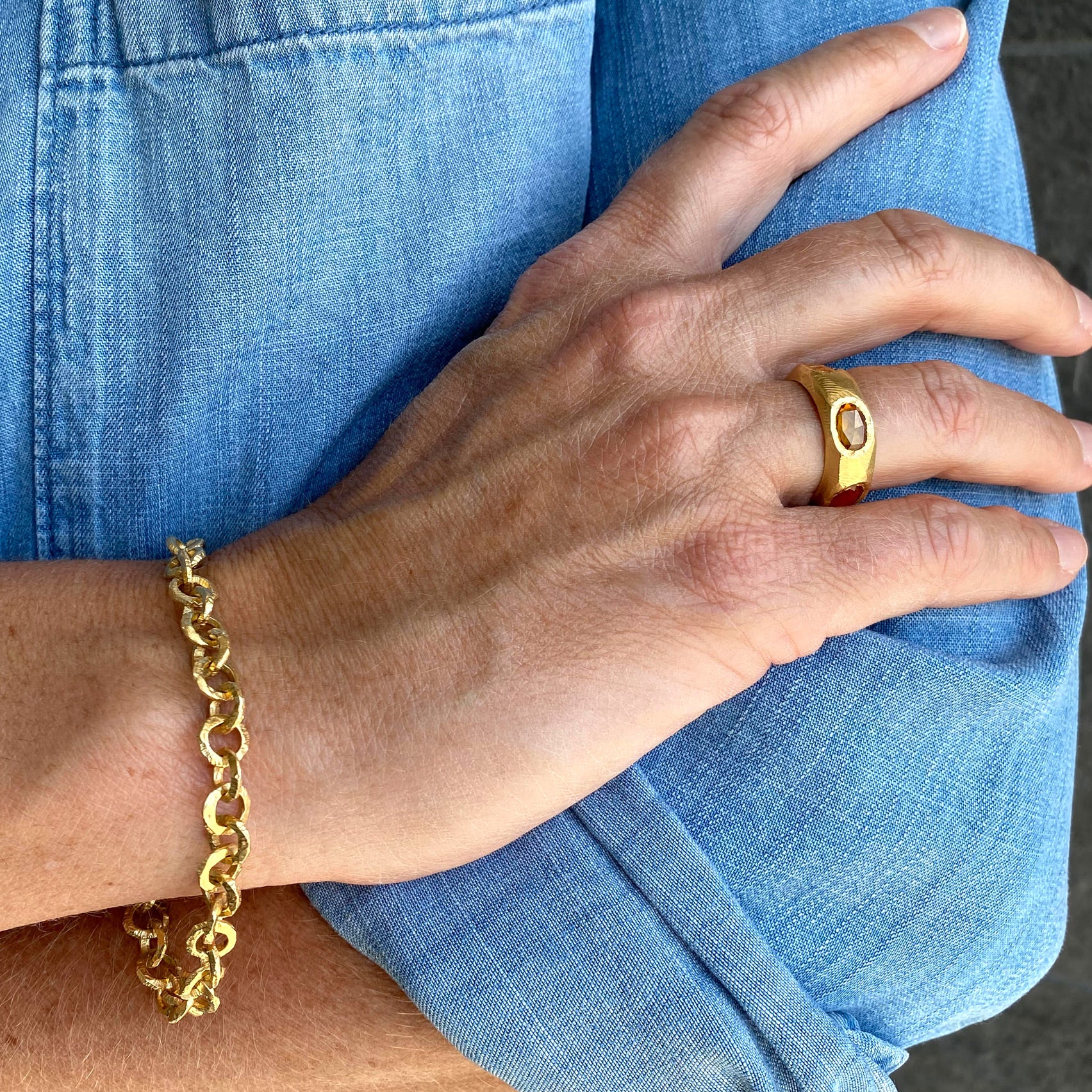 Wear a statement of rugged refinery in this hand carved, 18k yellow gold ring from Page Sargisson. The comfortably wide, deliciously textured band features a sunny honey burst of five freeform, orange rose cut sapphires totaling approximately 2.25 - 2.50cttw. Band width varies from 5mm wide to 6mm wide. Size 6.5. Handcrafted in Brooklyn, NY, U.S.