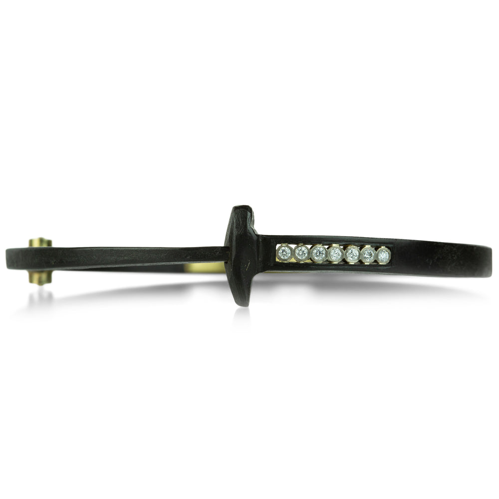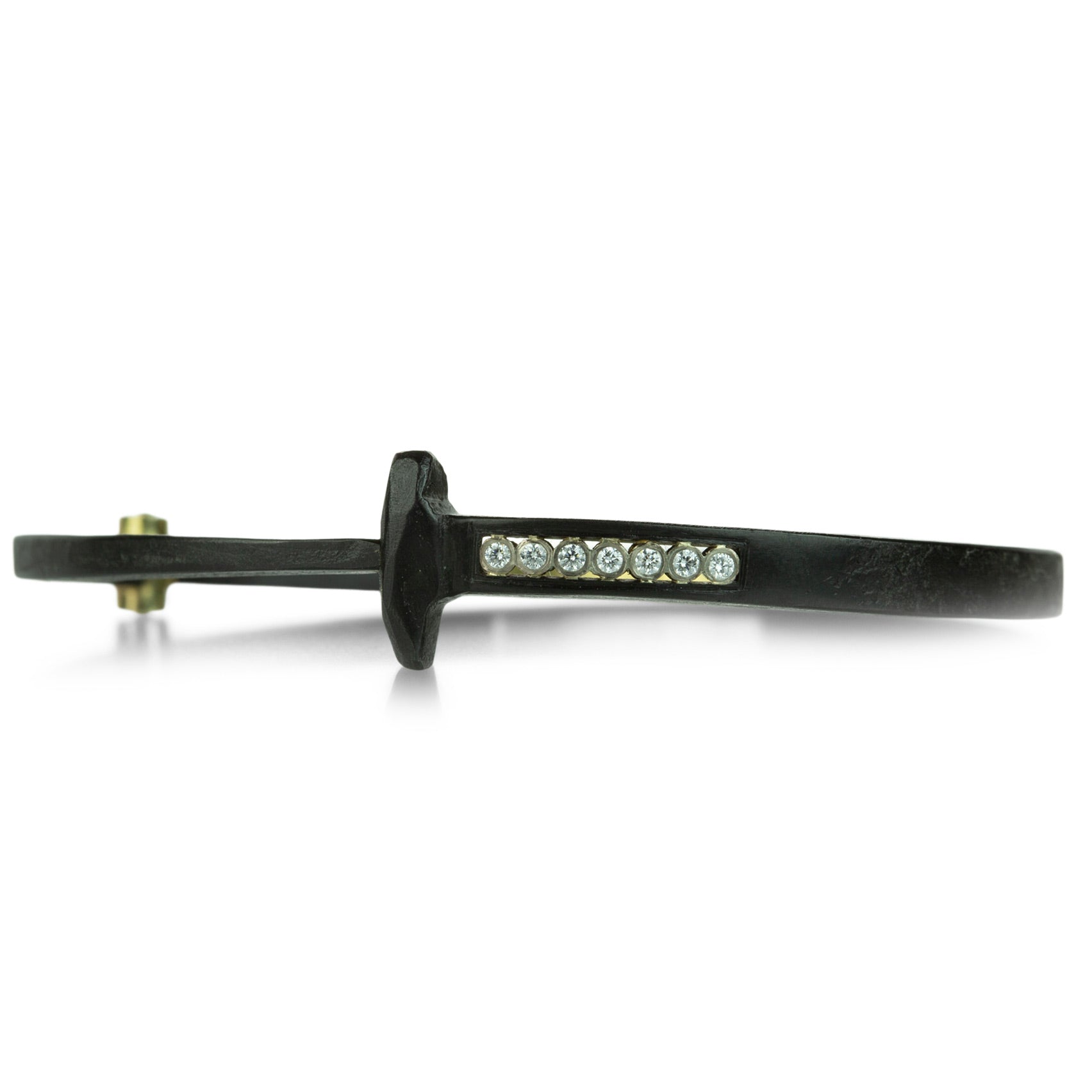 This exquisite Pat Flynn nail bracelet is a Quadrum favorite! An absolute must have for every bracelet stack, the hand forged iron bangle features a short stripe of seven diamonds totaling 0.09cttw set in palladium white gold bezels. Start an arm party of your own with this stunning piece. Custom 18k yellow gold hinge and snap closure. Inner diameter measures approximately 2 1/4" x just under 2". Handcrafted in High Falls, NY, U.S.