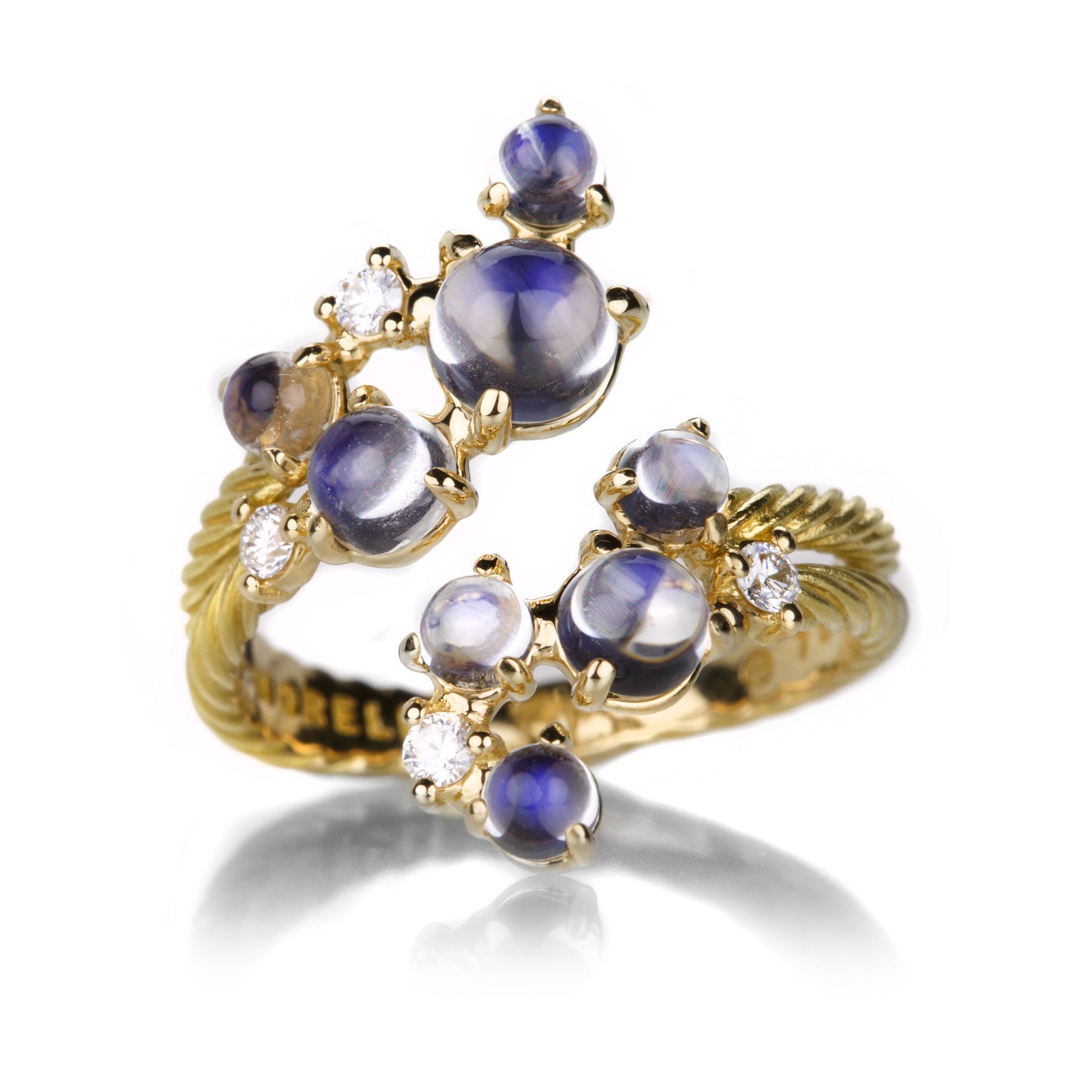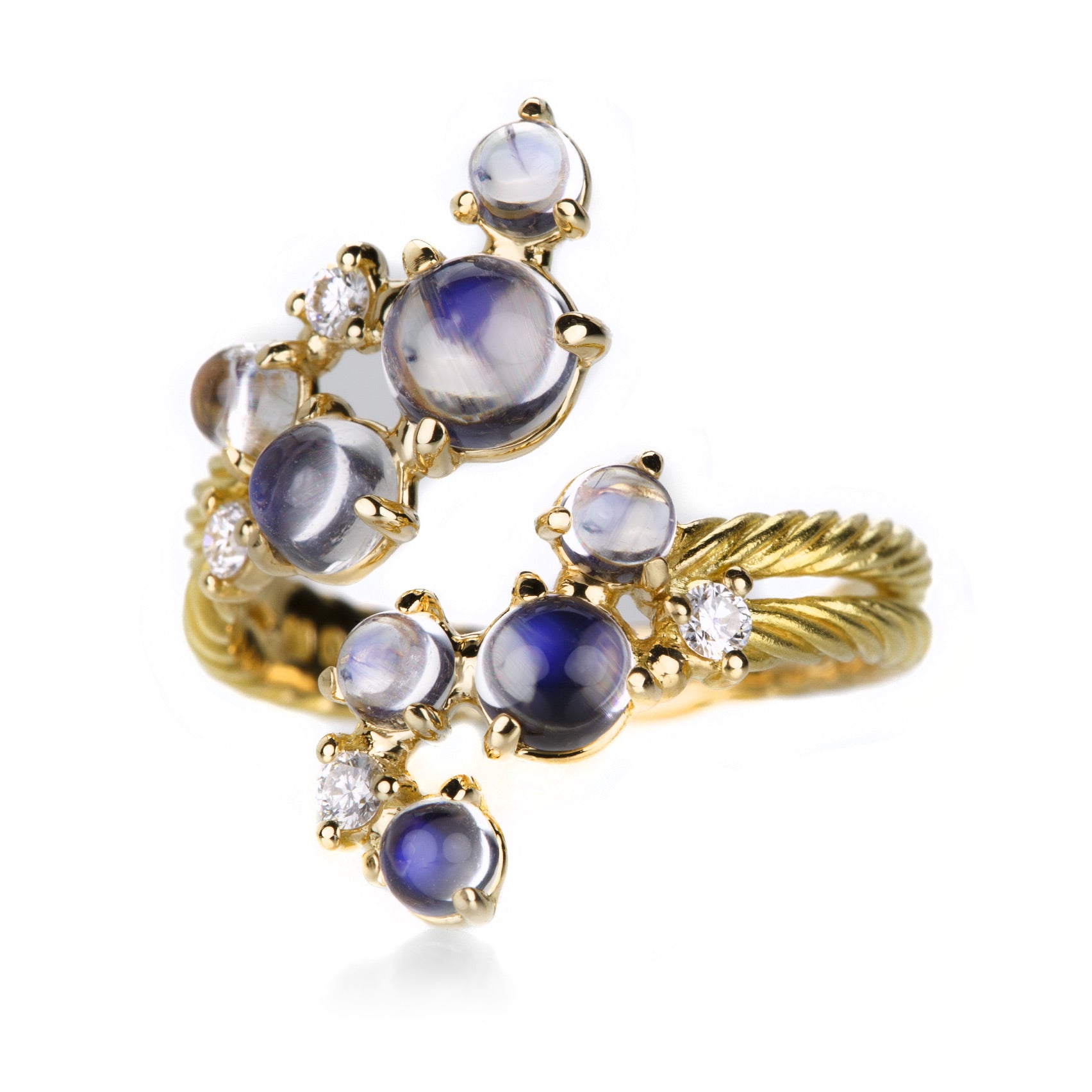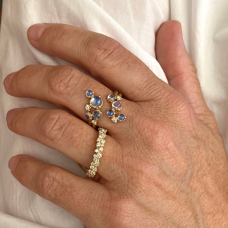 Bring out your playful side with this 18k yellow gold ring from Paul Morelli. Glowing moonstone cabochons totaling 1.90cttw and 0.14cttw of diamonds dance together with a rope detailed band as the hostess. From all the way across the room, this gorgeous ring makes a sophisticated statement of bubbling joy...it's wonderfully contagious! Size 7. Handcrafted in Philadelphia, PA, U.S.