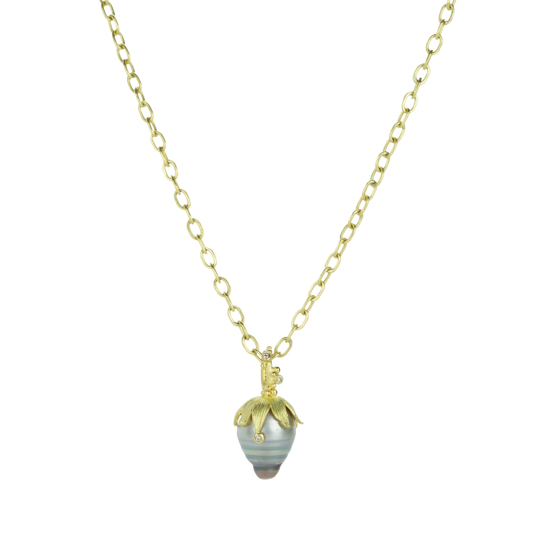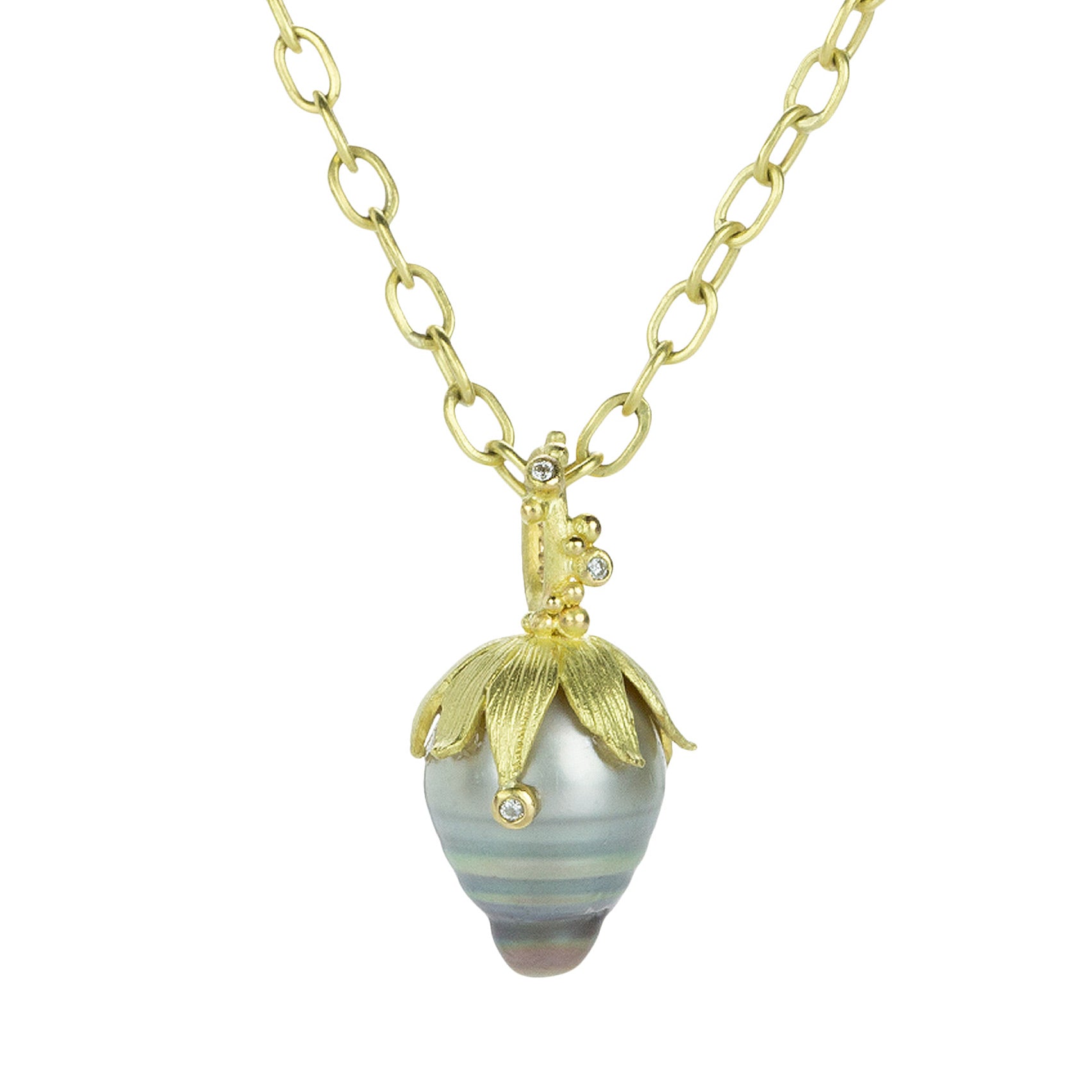 Look a little closer and uncover new worlds of fantasy and fascination in this 18k yellow gold strawberry pendant from Lene Vibe. A delectable gray Tahitian pearl is capped with a delicate leaf bail, dripping in dewy white diamonds totaling 0.03cttw. Pendant measures 1" x 1/2". Pendant only, chain sold separately. Handcrafted in Denmark.