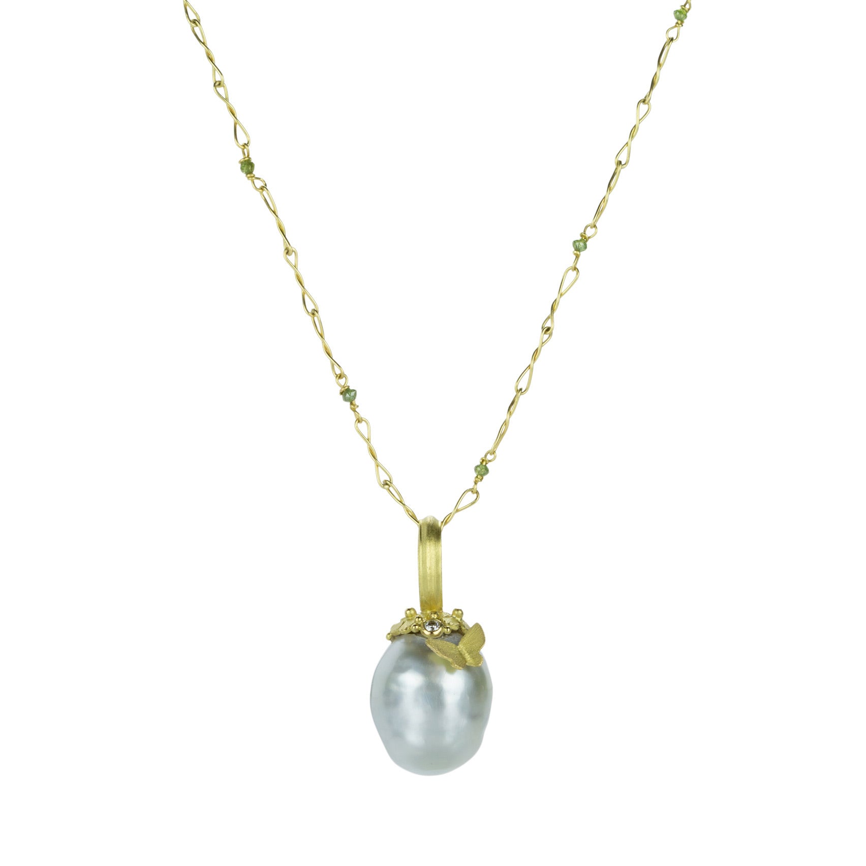 Inspired by the wondrous flora and fauna that surrounds us, this 18k yellow gold pendant from Lene Vibe features a light gray South Sea pearl with beautifully carved flowers and bezel set white diamonds totaling 0.03cttw. a detailed carved butterfly sits upon the pearl’s surface. Total length measures 1 3/8" including bail. Handcrafted in Denmark.