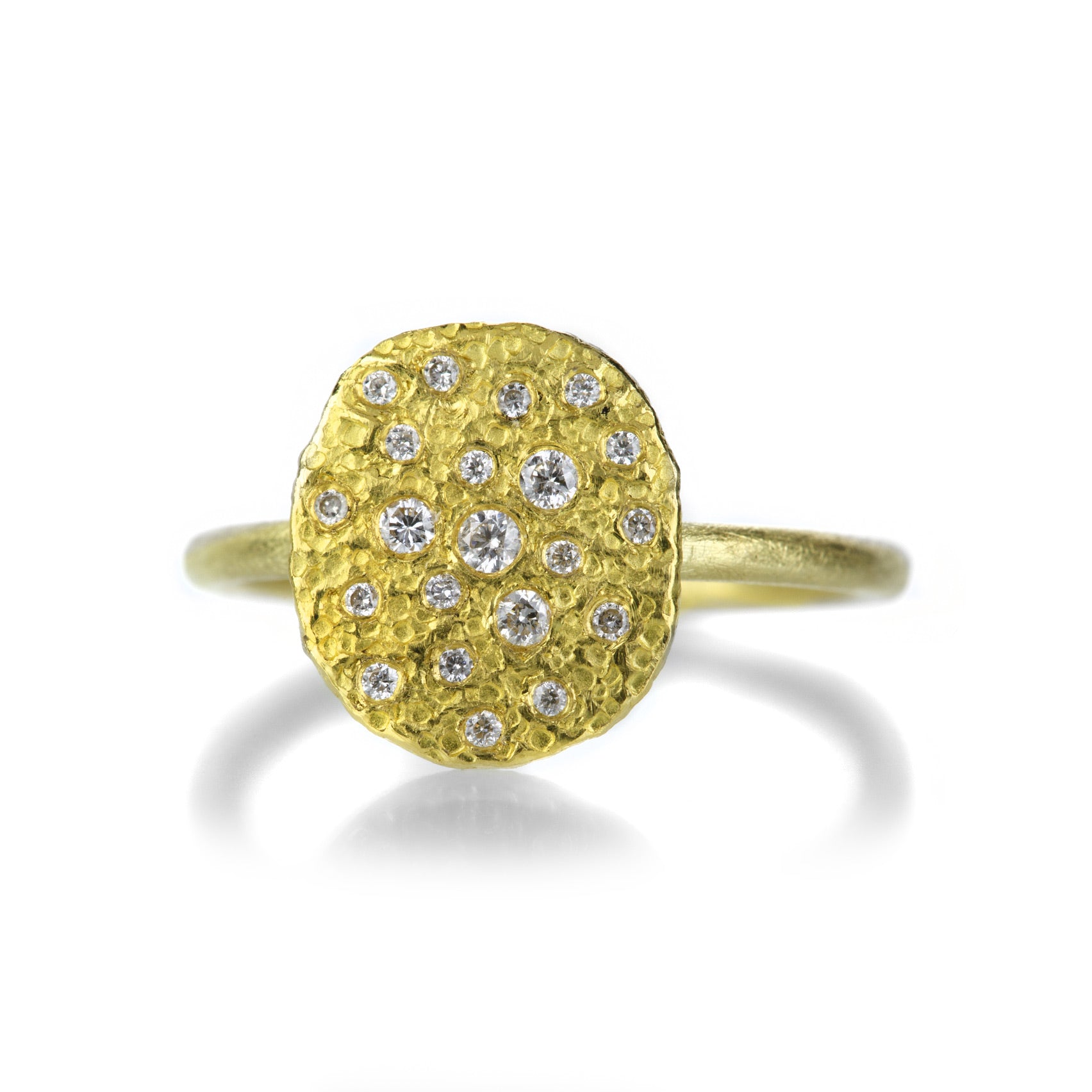 Unite your senses in this 18k and 22k yellow gold ring from Petra Class. A rounded, silk textured disc shimmers with scattered white diamonds. Disc measures 3/8” x 1/2” on a thin, rounded band. Size 6.25. Handcrafted in San Francisco, CA, U.S.