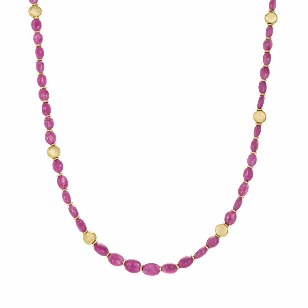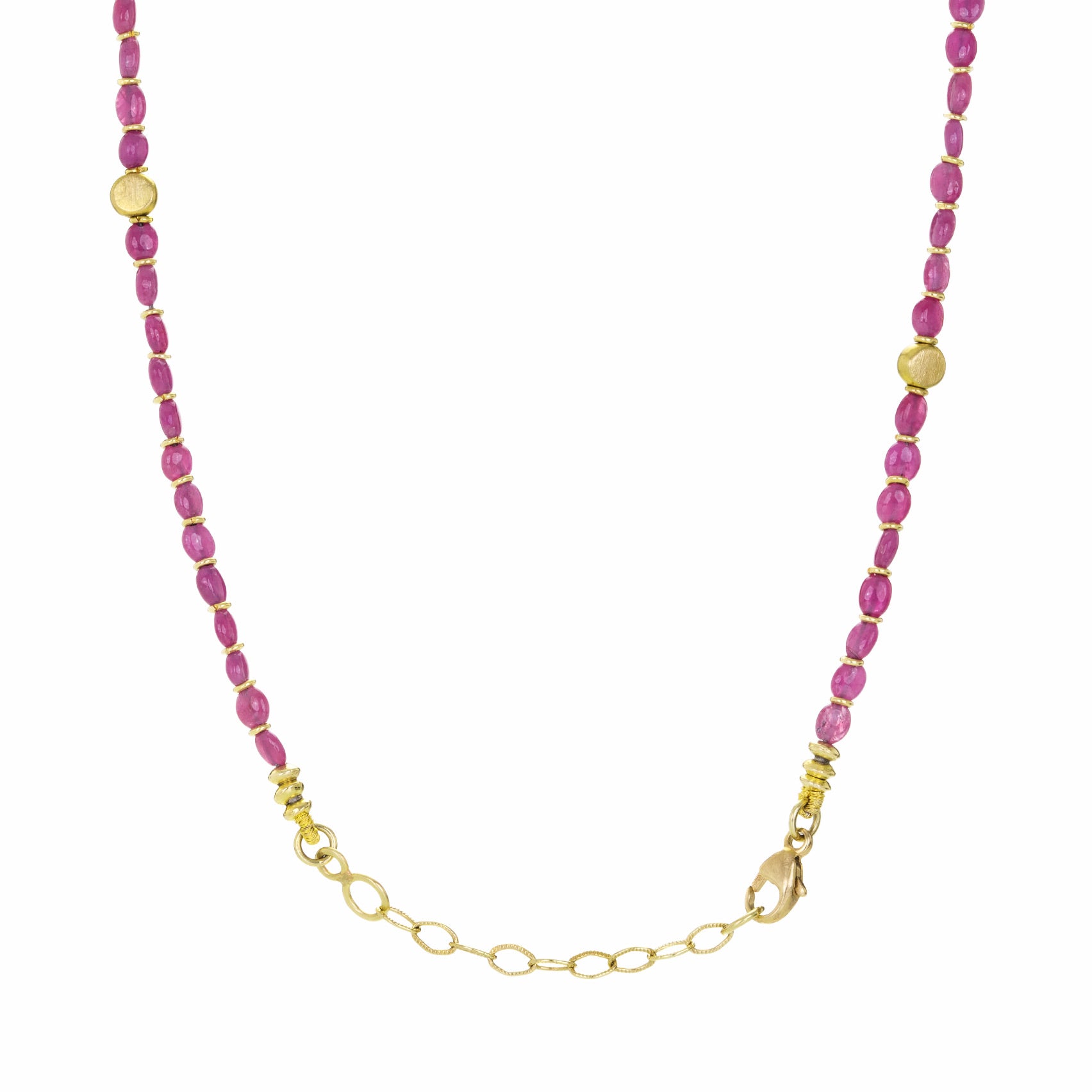 Rock some ruby red love energy in this 18k yellow gold gemstone necklace from Barbara Heinrich. Smooth oval ruby beads totaling 23.11cttw create a passionate garland for your neck, dotted with round gold wheel spacers and a lobster clasp. Total length measures 17½” including a 1 1/2“ extension chain. Handcrafted in Rochester, NY, U.S.