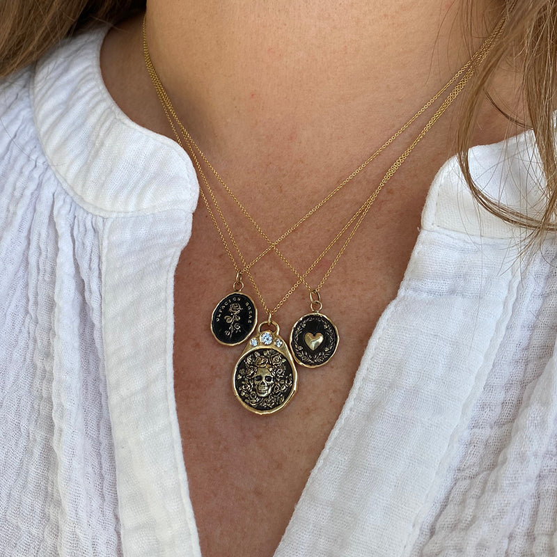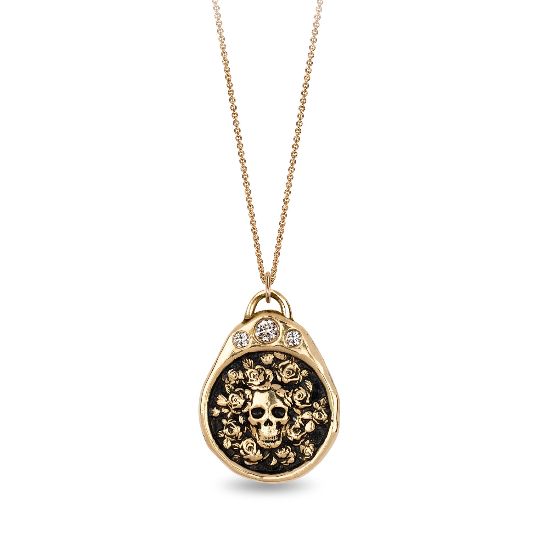 The roses, symbols of passion, and the skull, a representation of life's transience, together serve as a powerful reminder to engage fully in every moment of our fleeting existence. This Pyrrha pendant also features a crown of three conflict-free brilliant cut diamonds, symbolic of clarity and wisdom. Lovingly and sustainably cast in recycled 14k yellow gold with a layer of black ceramic, this potent talisman measures approximately 1" in total length including bail and hangs on an 18" 14k yellow gold fine cable chain with lobster clasp. Handcrafted in Vancouver, Canada.