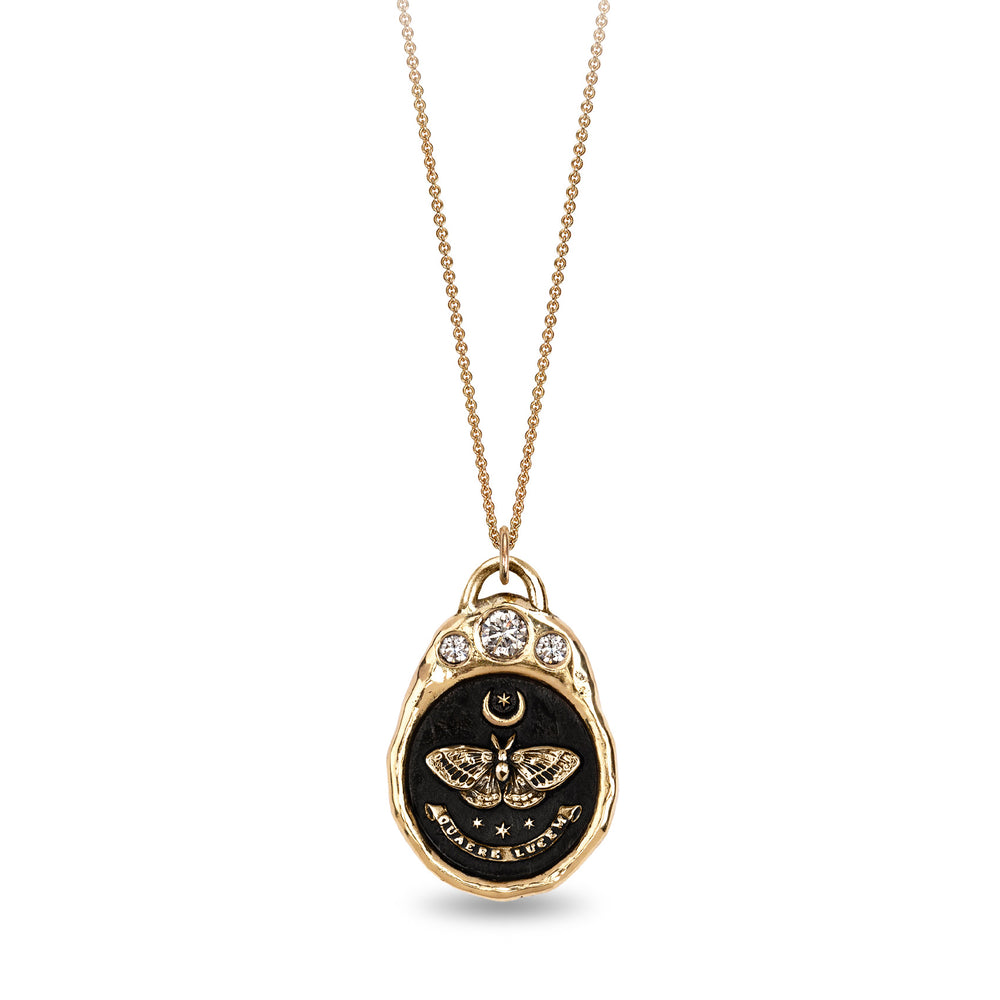 A crown of three brilliant diamonds tops this Pyrrha talisman that reads, 'Quaere Lucem' in Latin, meaning "Seek the Light." The moth is a reminder that the guiding light you are seeking is inside you. Follow your intuition to your path of transformation and realize your highest potential. Lovingly and sustainably cast in 14k yellow gold with a layer of black ceramic, this potent talisman hangs on an 18" fine cable chain with lobster clasp. Handcrafted in Vancouver, Canada.