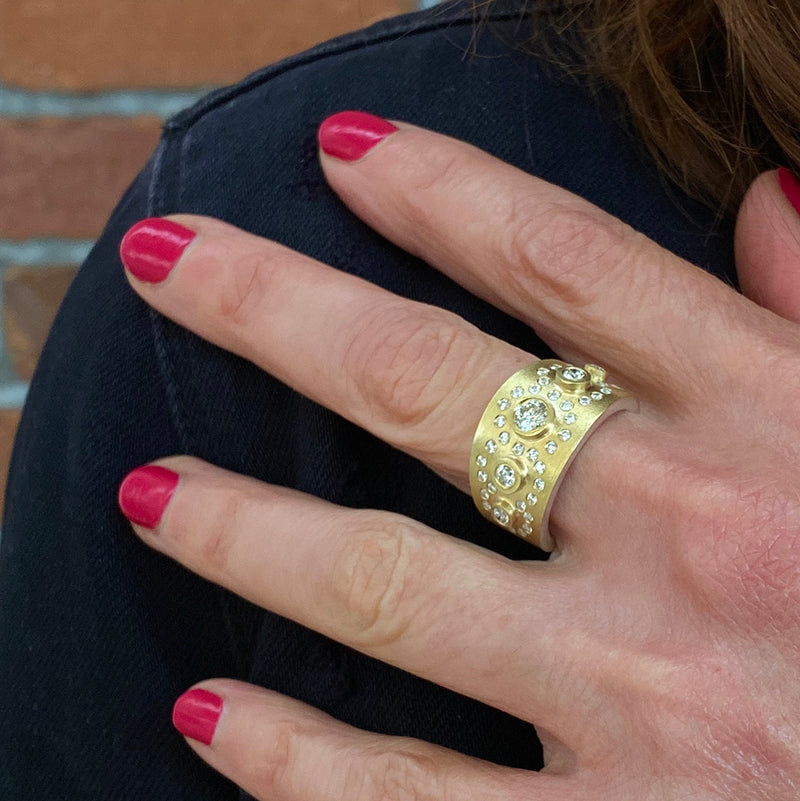A sparkling choice for a right hand ring, this 18k yellow gold over sterling silver piece from Rene Escobar exudes an elegant strength. Bezel set white diamonds are accented by halos of small surface set white diamonds, all totaling 1.17cttw. Meticulous detailing gives the gold surface a glowing, refined texture. Band measures 14mm wide in the front and tapers to 6.6mm wide in the back. Size 7. Handcrafted in Miami, FL, U.S. Handcrafted in Miami, FL, U.S.