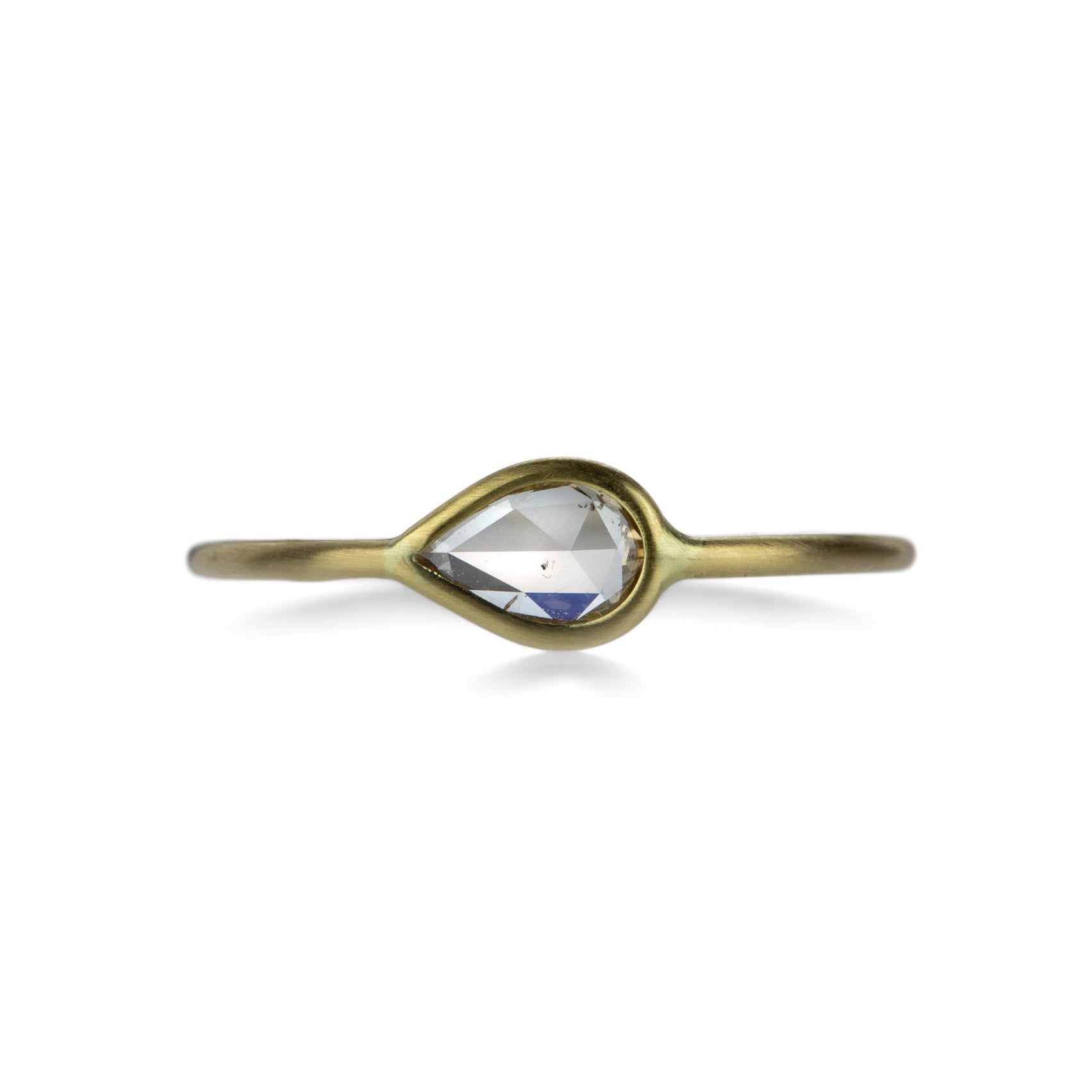 If sparkle is your style, this 18k yellow gold ring from Margaret Solow serves as an alternative engagement choice or as top spot in your stack! Featuring a rose cut, east-west set 0.36ct pear shaped champagne diamond, this ring is the perfectly pretty accent for your own natural beauty! Stone measures approximately 1/4" x 1/4". Size 8. Handcrafted in Los Angeles, CA, U.S.