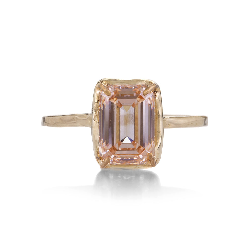 Ultra modern with a rush of romance, this 14k yellow gold ring from Robin Haley features an emerald cut, lab grown 2.76ct pink diamond. The glittering stone sits in an organic molten prong setting on a thin, 1.5mm band. Size 7.5. Handcrafted in Nashville, TN, U.S.