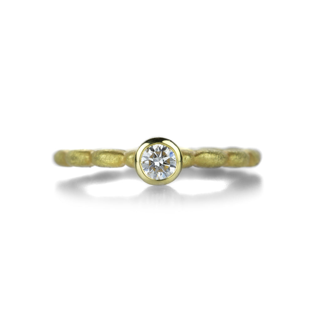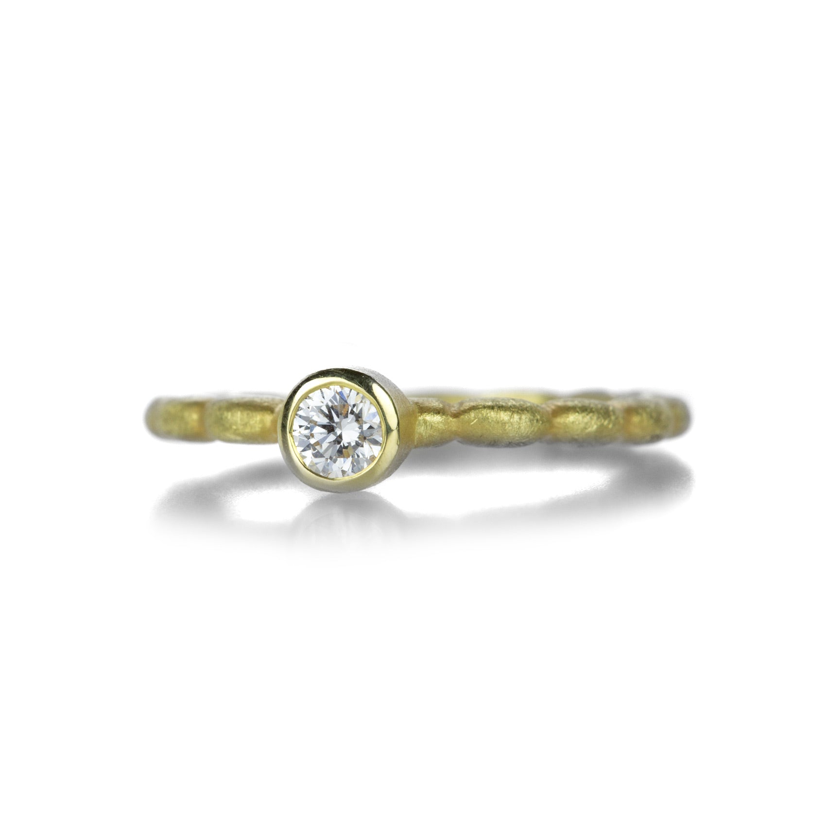 Say yes to this refined, understated symbol of forever from Barbara Heinrich. Crafted in 18k yellow gold, this stackable engagement ring features charming pillow band detailing and a sparkling bezel set round, 0.18ct 3.5mm diamond. Size 7. Handcrafted in Rochester, NY, U.S.
