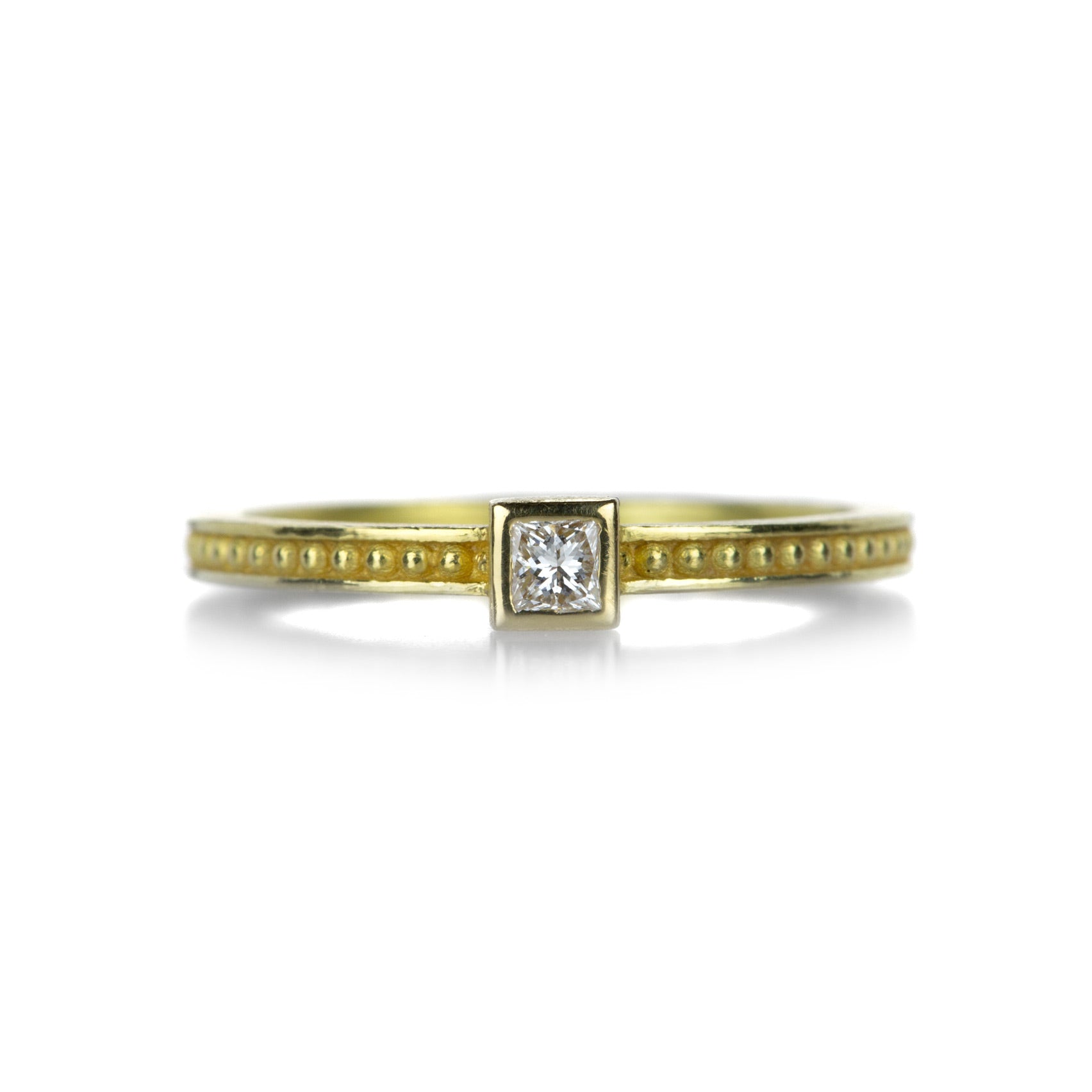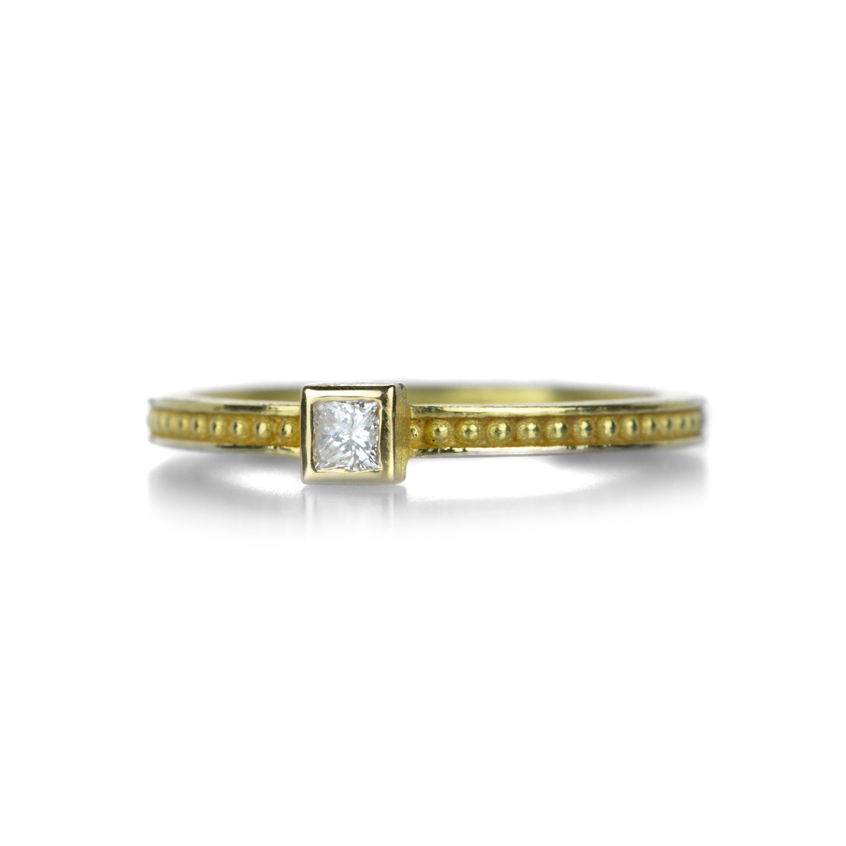 Just what your stack is missing, this 18k yellow gold ring from Barbara Heinrich isn’t afraid to stand alone as well! A granulation detailed band holds a 2.6mm bezel set, sparkling 0.10ct square white diamond. Band measures 2mm wide. Size 7. Handcrafted in Rochester, NY, U.S.