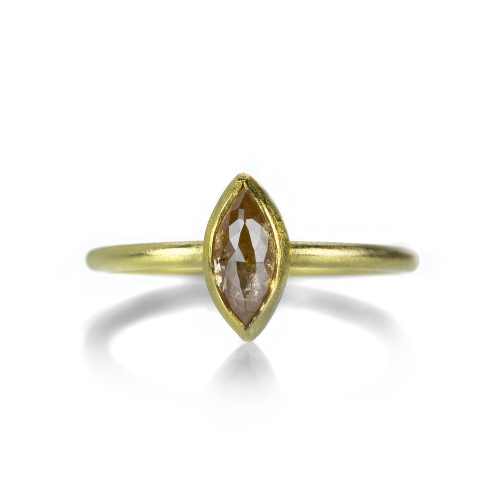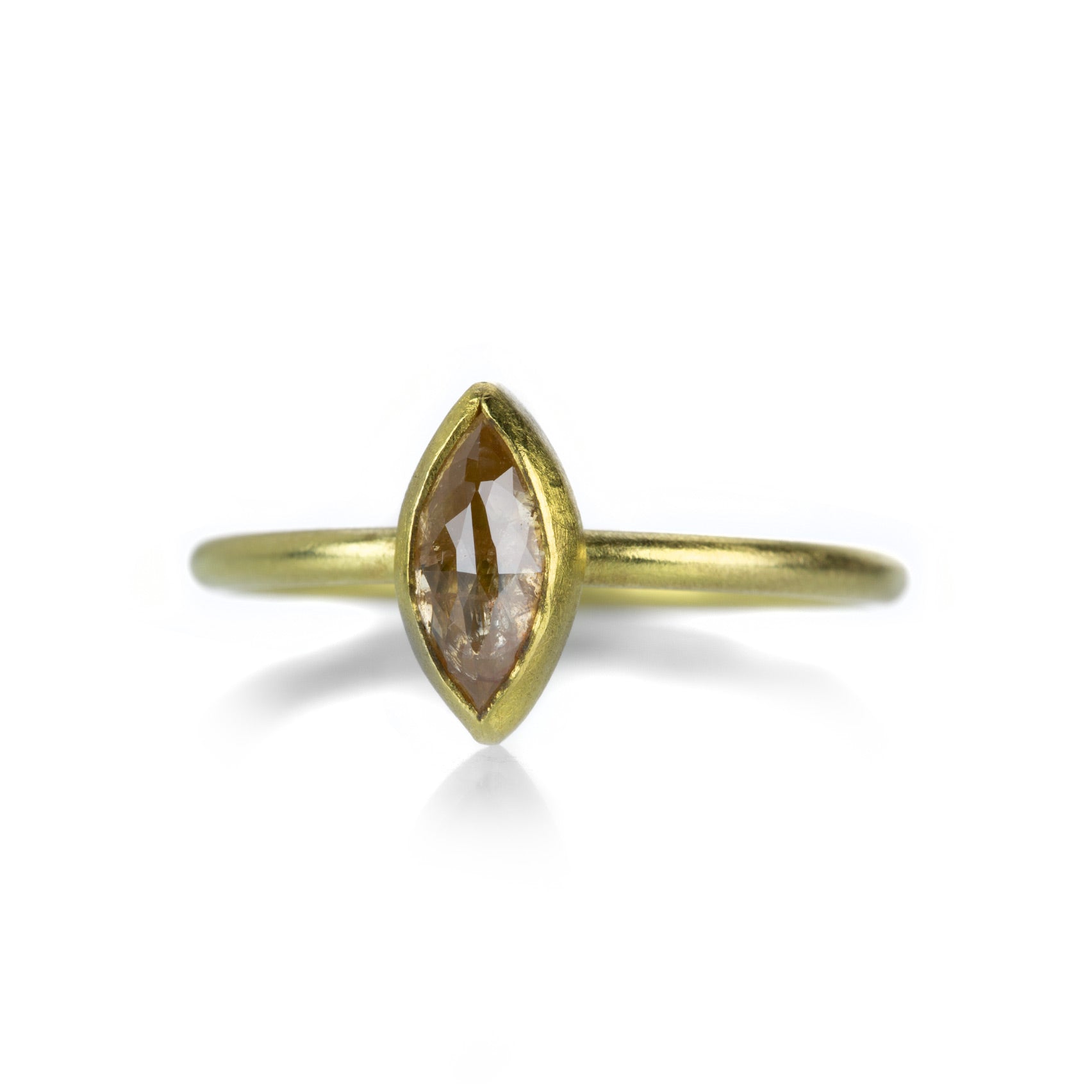 Stack on a flash of fiery sparkle in this 18k and 22k yellow gold ring from Petra Class. A small, rose cut marquise diamond is set in a bezel and sits atop a rounded brushed gold band. Size 6.25. Handcrafted in San Francisco, CA, U.S.