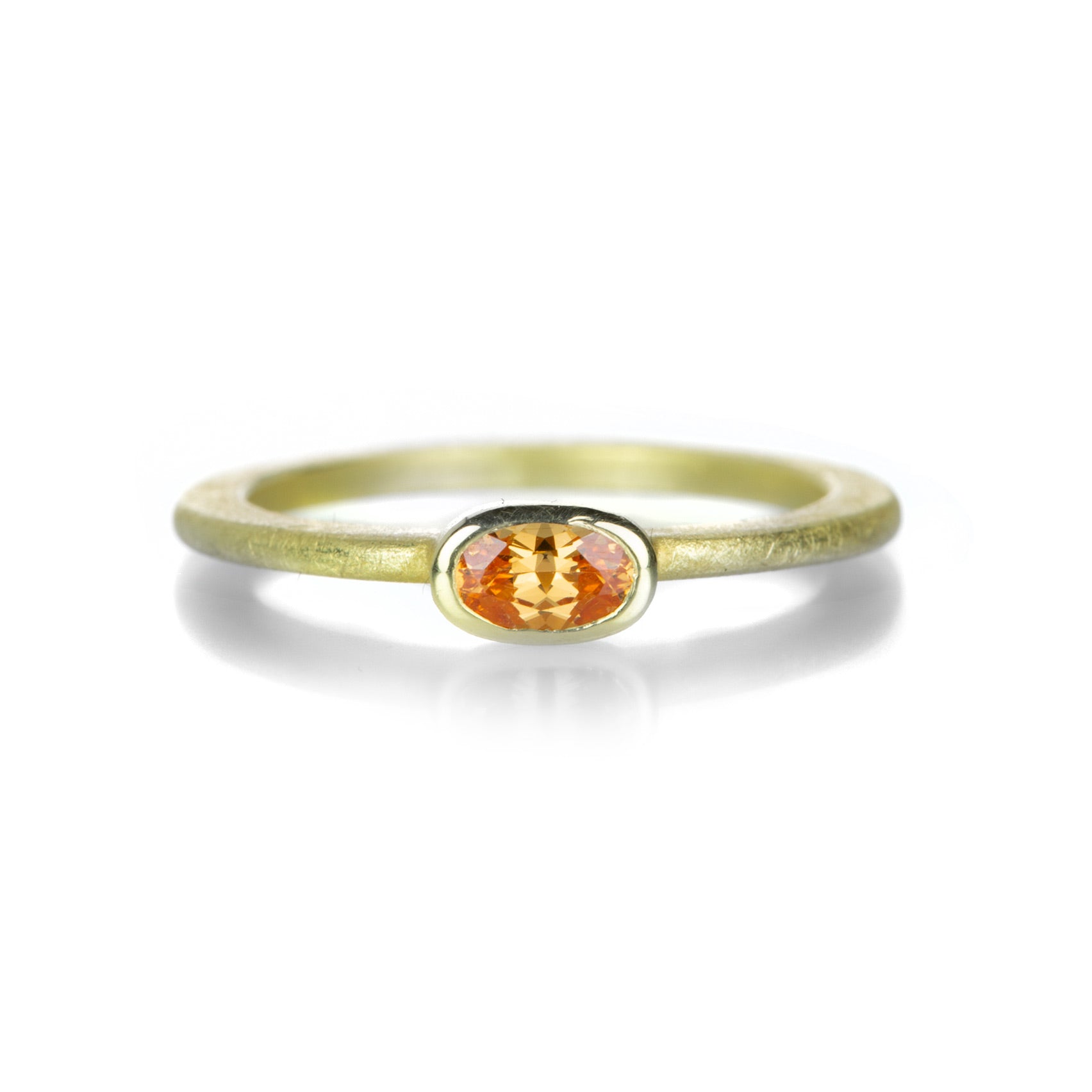 A beautiful day is on the horizon in this 18k yellow gold stacking ring from Barbara Heinrich. An oval, 0.32ct spessartite garnet is set east-west in a polished bezel, and sits atop a flat textured band. Size 6. Handcrafted in Rochester, NY, U.S.