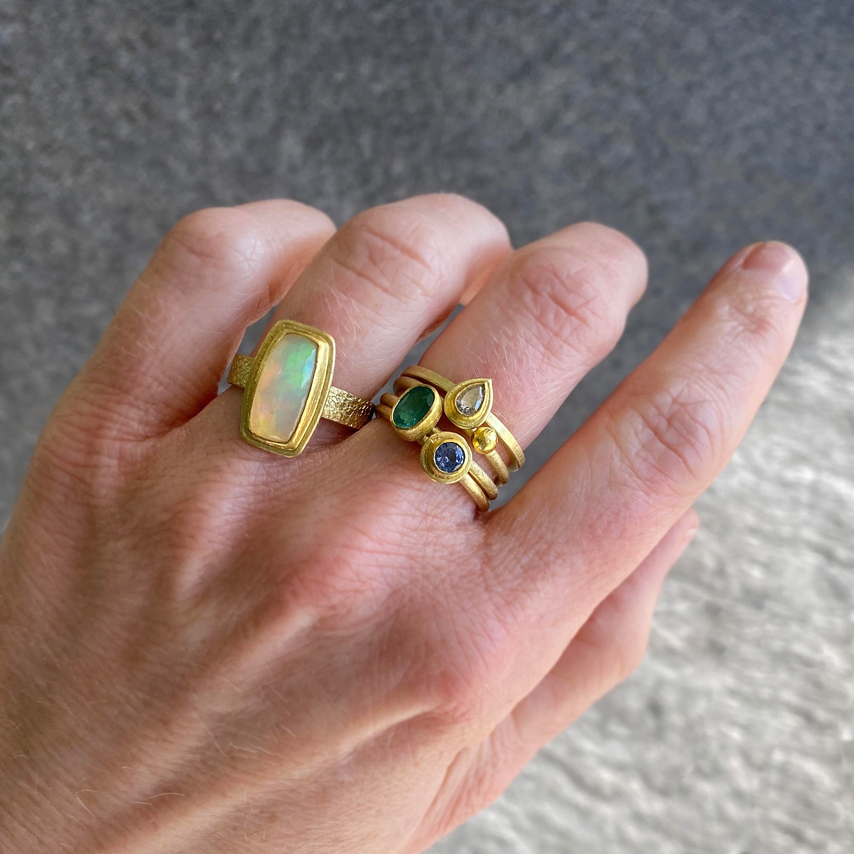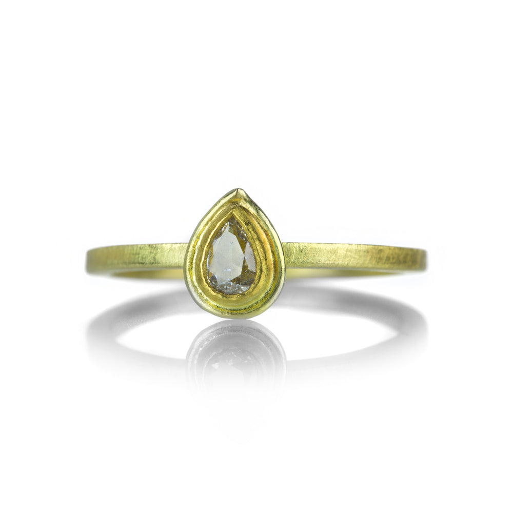 Stack on a flash of fiery sparkle in this 18k and 22k yellow gold ring from Petra Class. A small, rose cut teardrop diamond is set in a framed bezel and sits atop a square brushed gold band. Size 6.5. Handcrafted in San Francisco, CA, U.S.