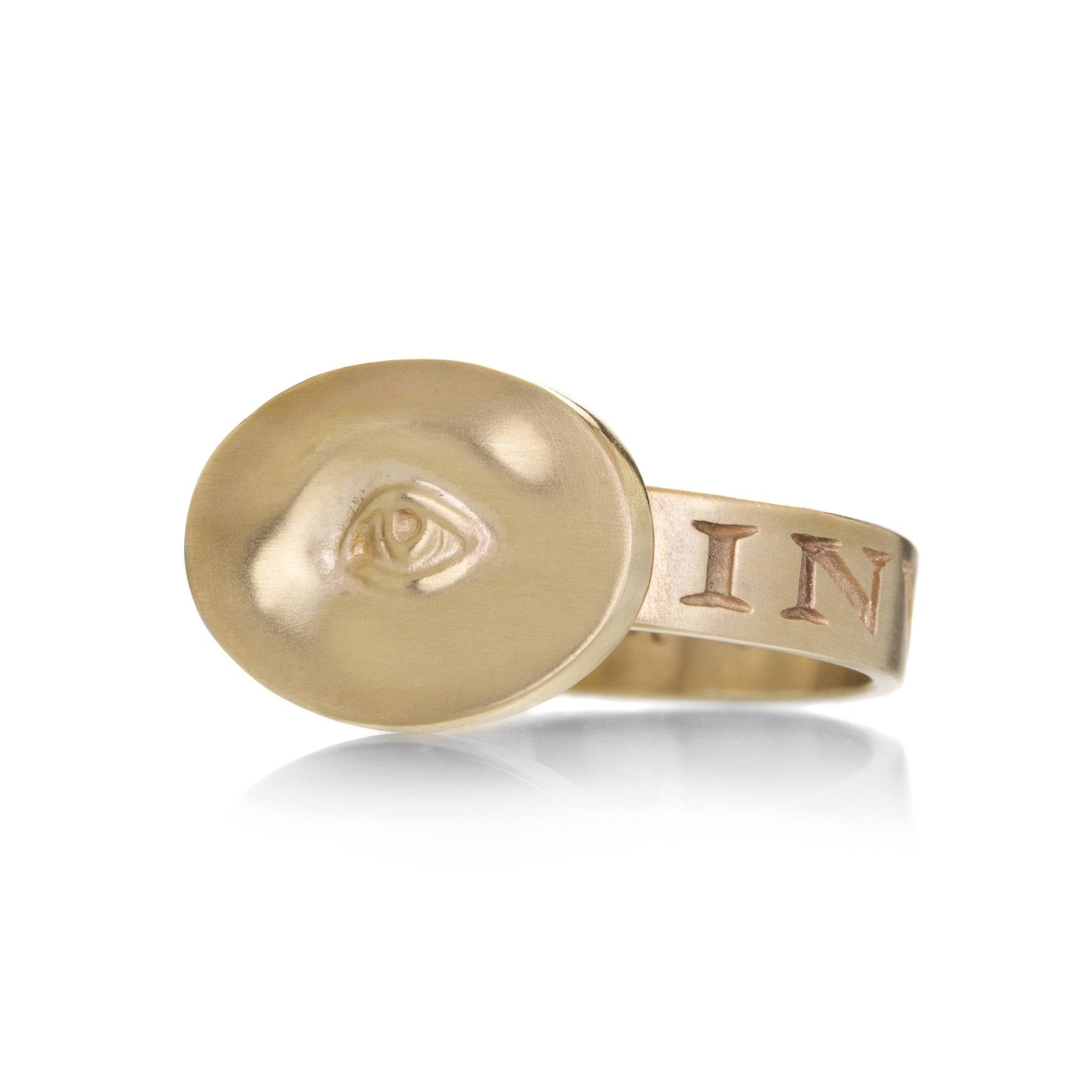 Gabriella Kiss’ "Love Token" series was inspired by the 19th century tradition of gifting a painted eye to a loved one. Find your own personal meaning in this 10k yellow gold carved eye ring, inscribed with the Latin word “INVIGILARE," which translates to "to watch over.” Size 6.25. Handcrafted in Hudson Valley, NY, U.S.