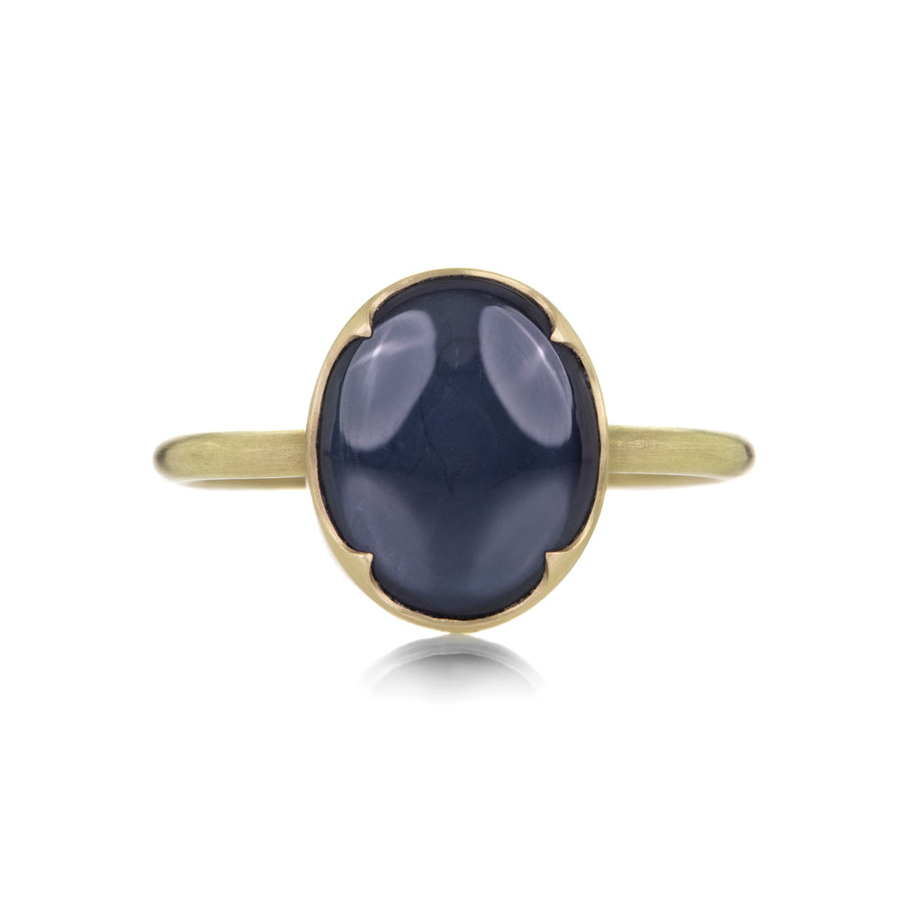 Celebrate natural beauty in this 18k yellow gold ring from Gabriella Kiss. A silky smooth, 3.80ct dreamy blue star sapphire is set in the artist’s signature four scalloped bezel. Stone measures 1/2” x 3/8” on a thin round band. Size 6.75. Handcrafted in Hudson Valley, NY, U.S.
