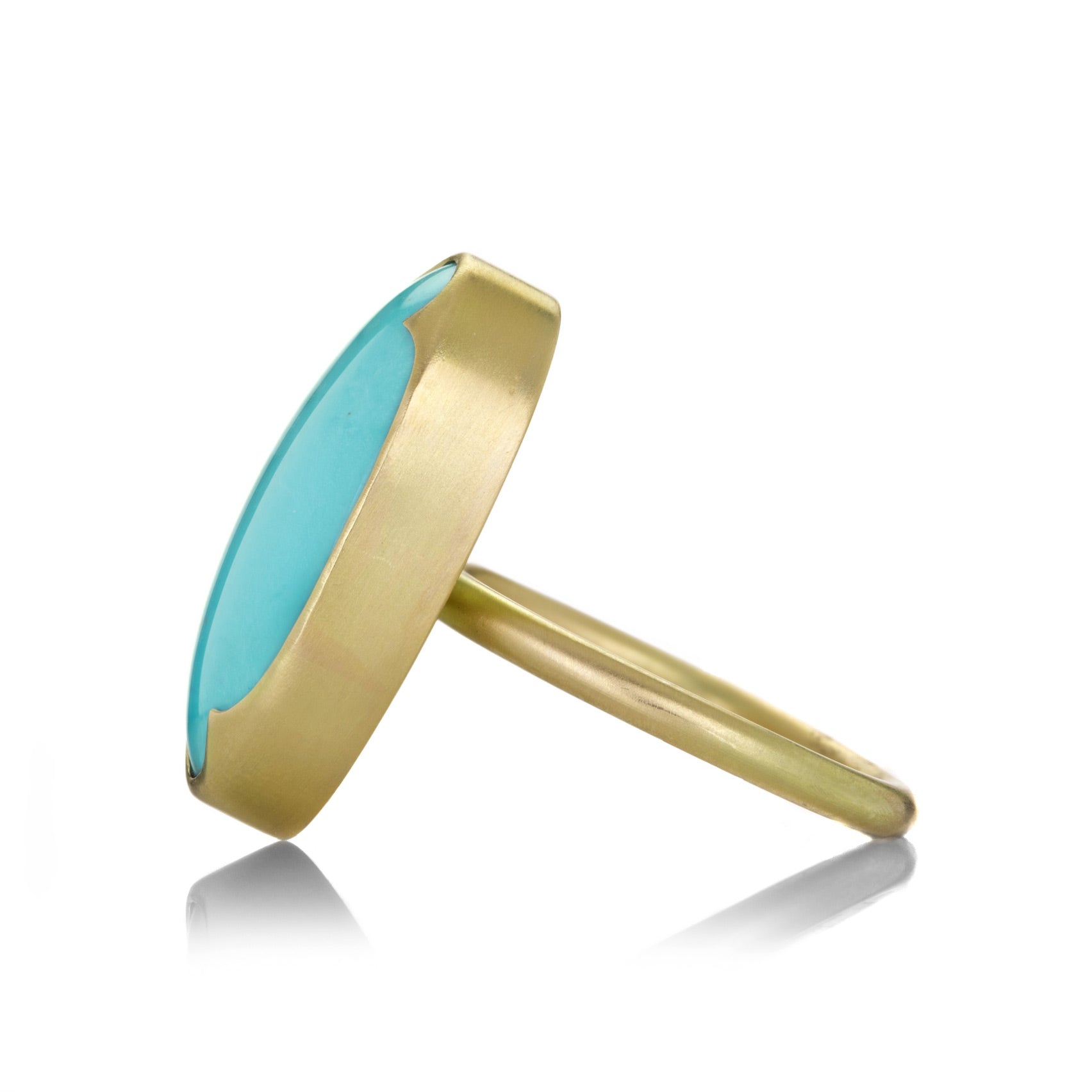 Elegant in form and bold in its brilliance, this 18k yellow gold ring from Gabriella Kiss brings calm to any storm. A large 15.0ct Persian turquoise cabochon is set in a smooth brushed bezel, highlighting its natural beauty. Stone measures approximately 1/2" x 7/8". Size 6.75. Handcrafted in Hudson Valley, NY, U.S.