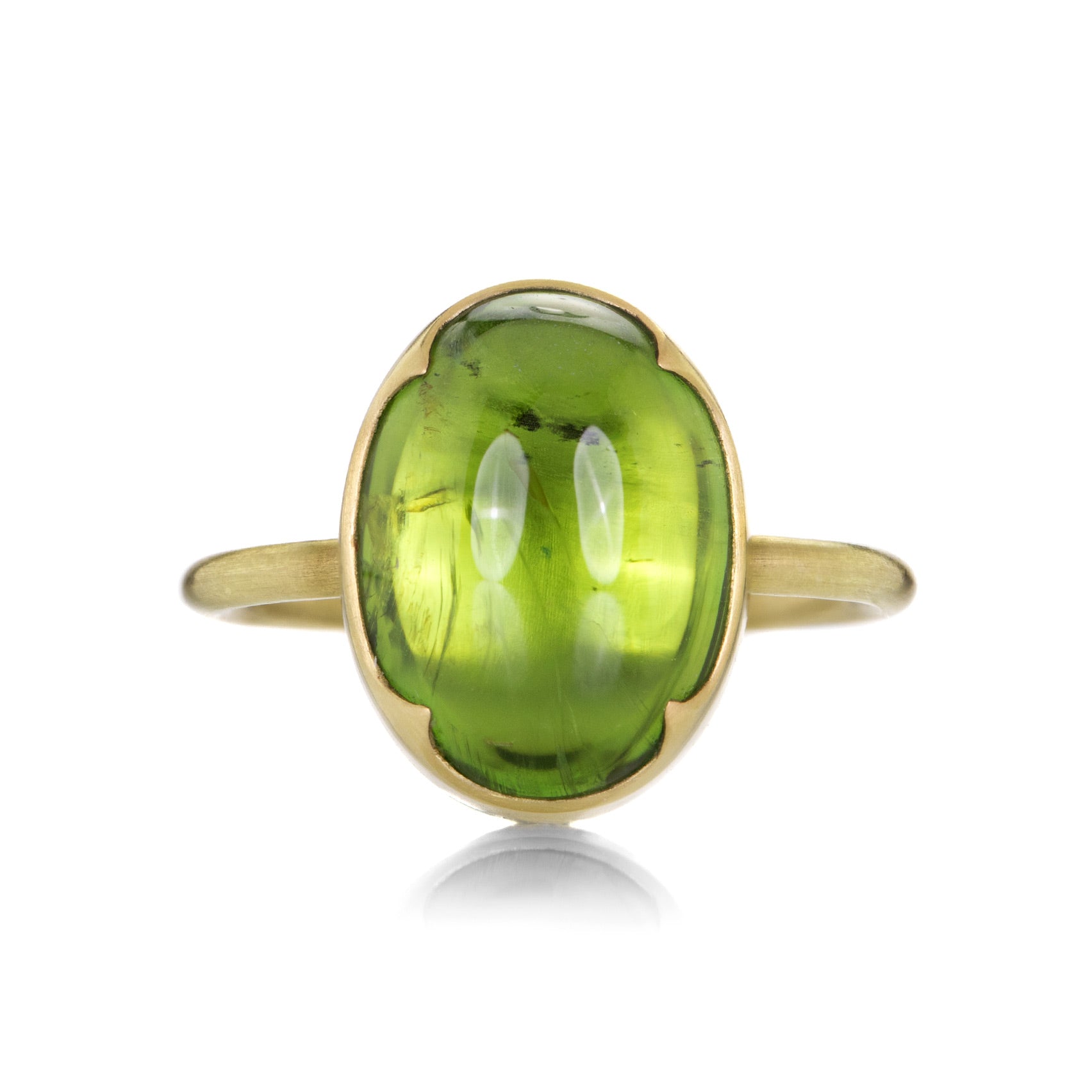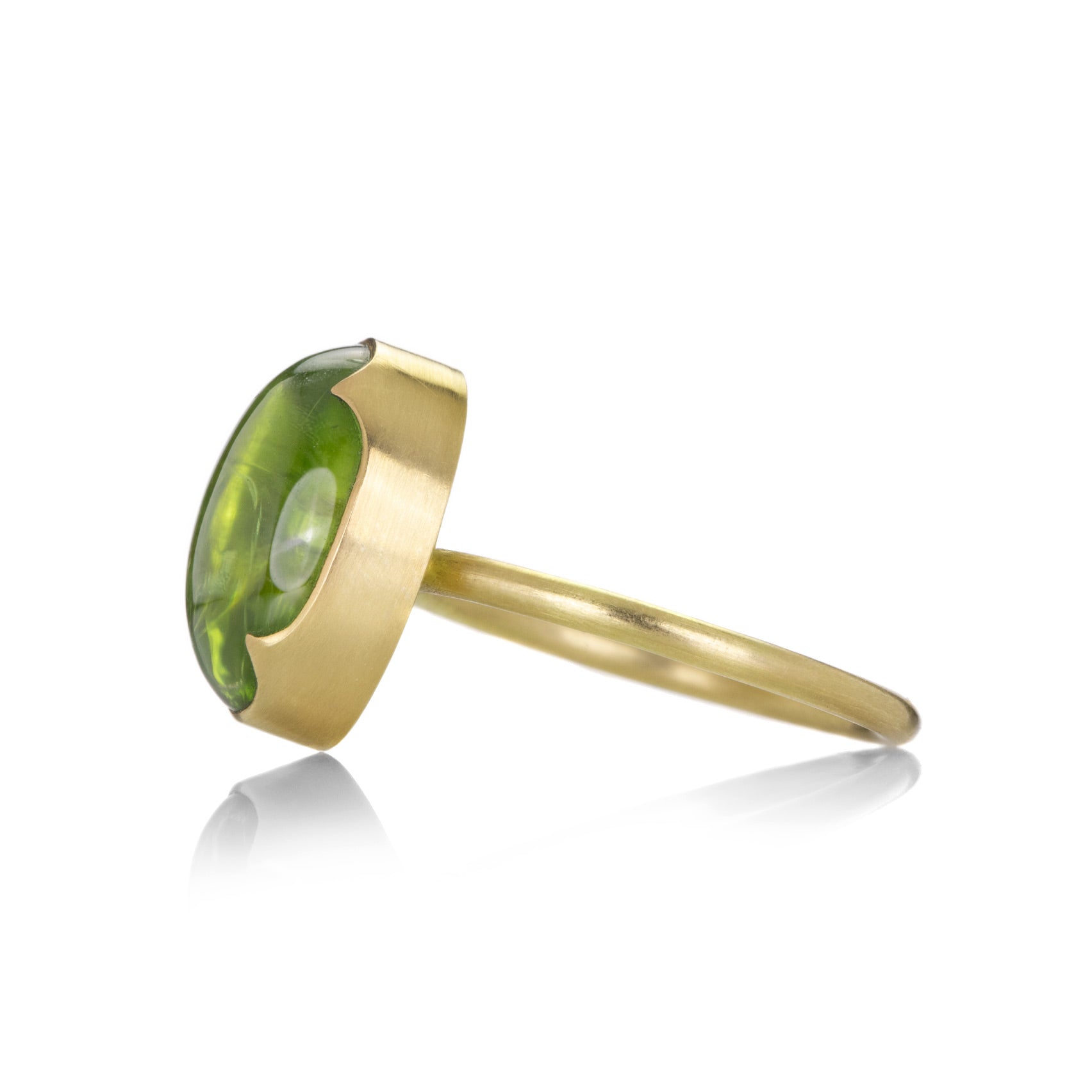 Like the radiant light of the heart center, this 18k yellow gold ring from Gabriella Kiss just beams compassion. Featuring a smooth 7.30ct oval peridot set in the artist’s signature scalloped bezel, this ring will have you feeling like the goddess of love. Stone measures 1/2” x 3/8”. Size 6.75. Handcrafted in Hudson Valley, NY, U.S.