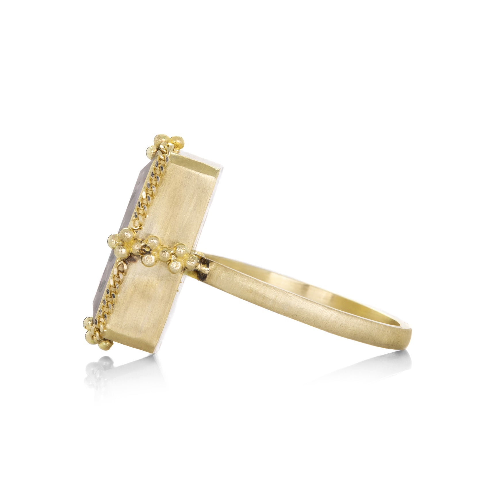 A true one of a kind, this 18k yellow gold ring from Amali starts the conversation! A large 10.42ct quartz with dazzling pyrite inclusions is set in a chain and granulation detailed bezel. Stare into this piece’s starry depths and get inspired! Stone measures 1/2" x 3/4". Size 6.75. Handcrafted in New York, NY, U.S.