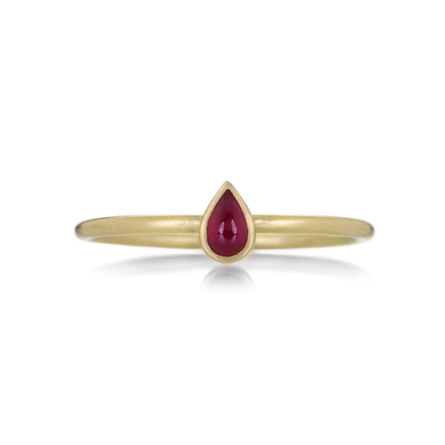 This perfectly petite stacking ring from Gabriella Kiss ring features a small but mighty red ruby pear shaped cabochon. The warm 18k yellow gold bezel setting and band has a lovely satin finish. Stone measures just under 1/4" x 1/8“. Size 6.5. Handcrafted in Hudson Valley, NY, U.S.