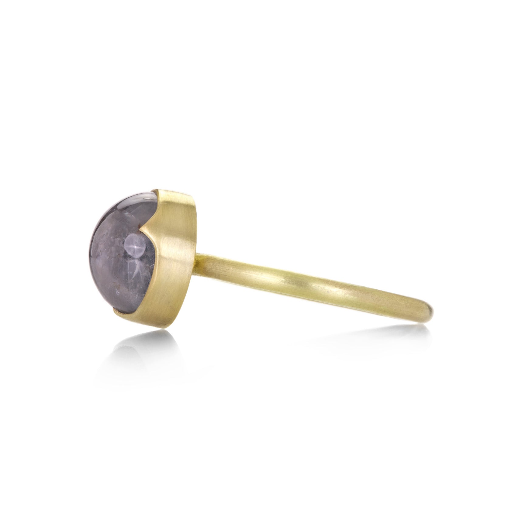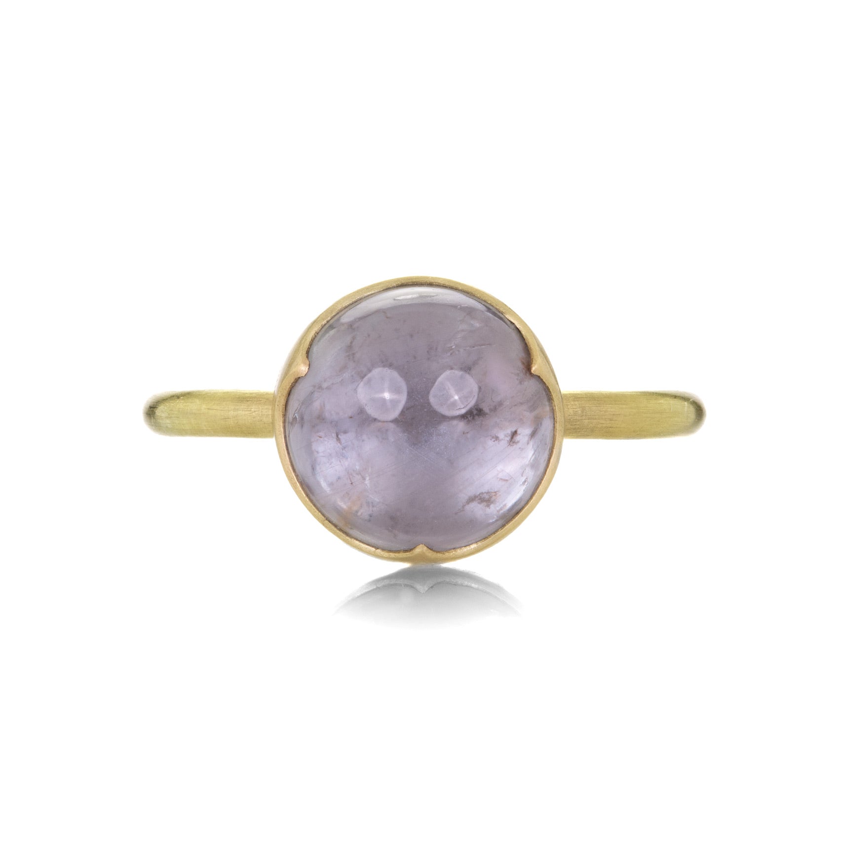 Get lost in the hazy hue of this gorgeous 18k yellow gold ring from Gabriella Kiss! A smooth, round 5.77ct lavender-mauve sapphire is set in the artist’s signature three scalloped bezel. A most unusual gem, the stone is the star on a thin, round band. Stone diameter measures 3/8". Size 6.75. Handcrafted in Hudson Valley, NY, U.S.