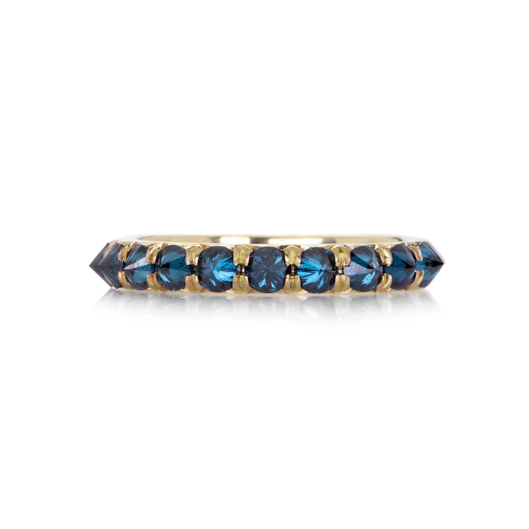 Rock some edge into your ring stack with this 18k yellow gold half eternity band from Tamsin Rasor. Fiery blue diamonds totaling 0.80cttw are set inverted along the face. This intriguing ring features a high polish finish and an elegant knife edge band. Band width measures 3mm. Size 5.75. Handcrafted in New York, NY, U.S.