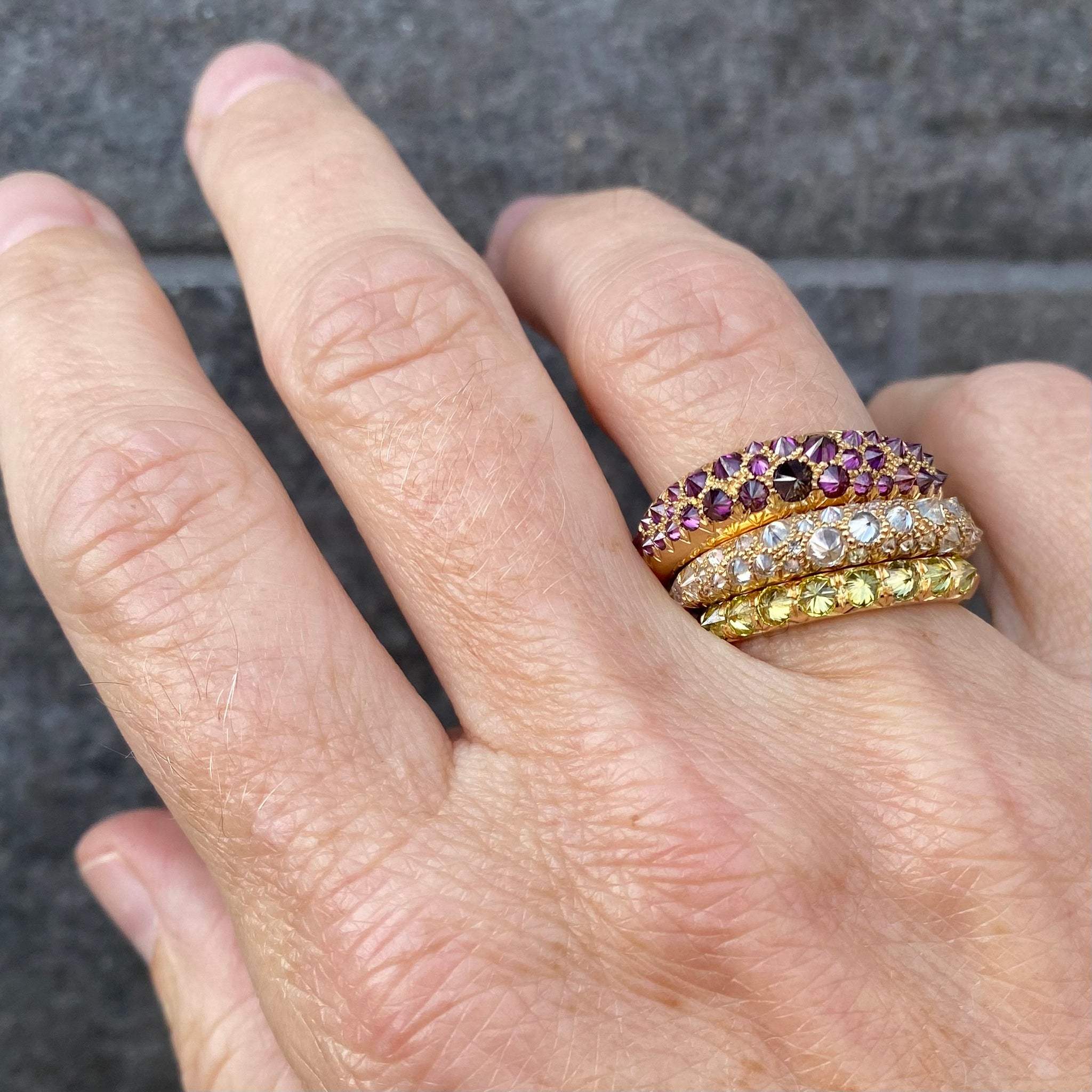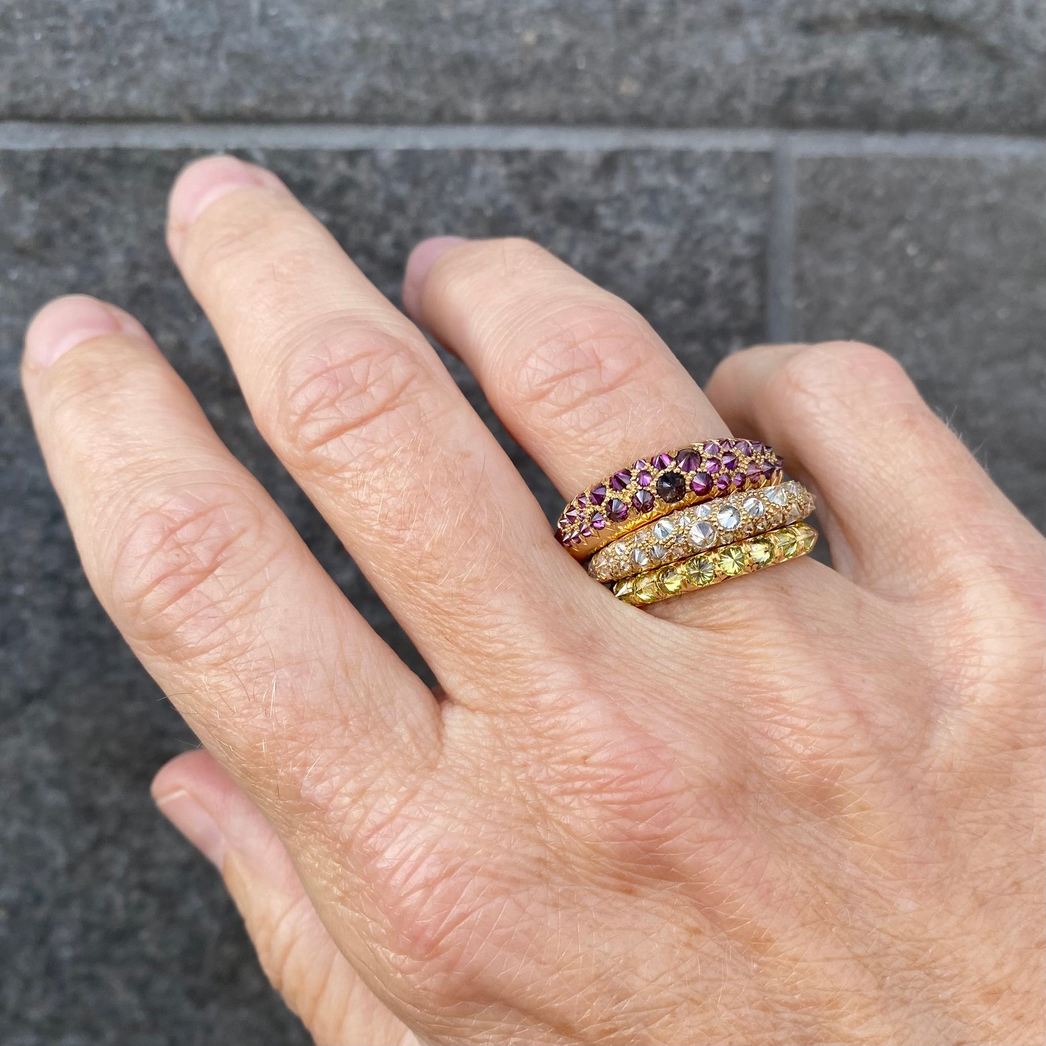 Sparkle with the light of a million suns in this breathtaking ring from Tamsin Rasor. An 18k tapered band is covered with inverted white diamonds totaling 1.13cttw. This luxurious show piece beams with fiery magic and features an elegant high polish finish. Band width measures 4.5mm, tapering to 2mm. Size 7. Handcrafted in New York, NY, U.S.