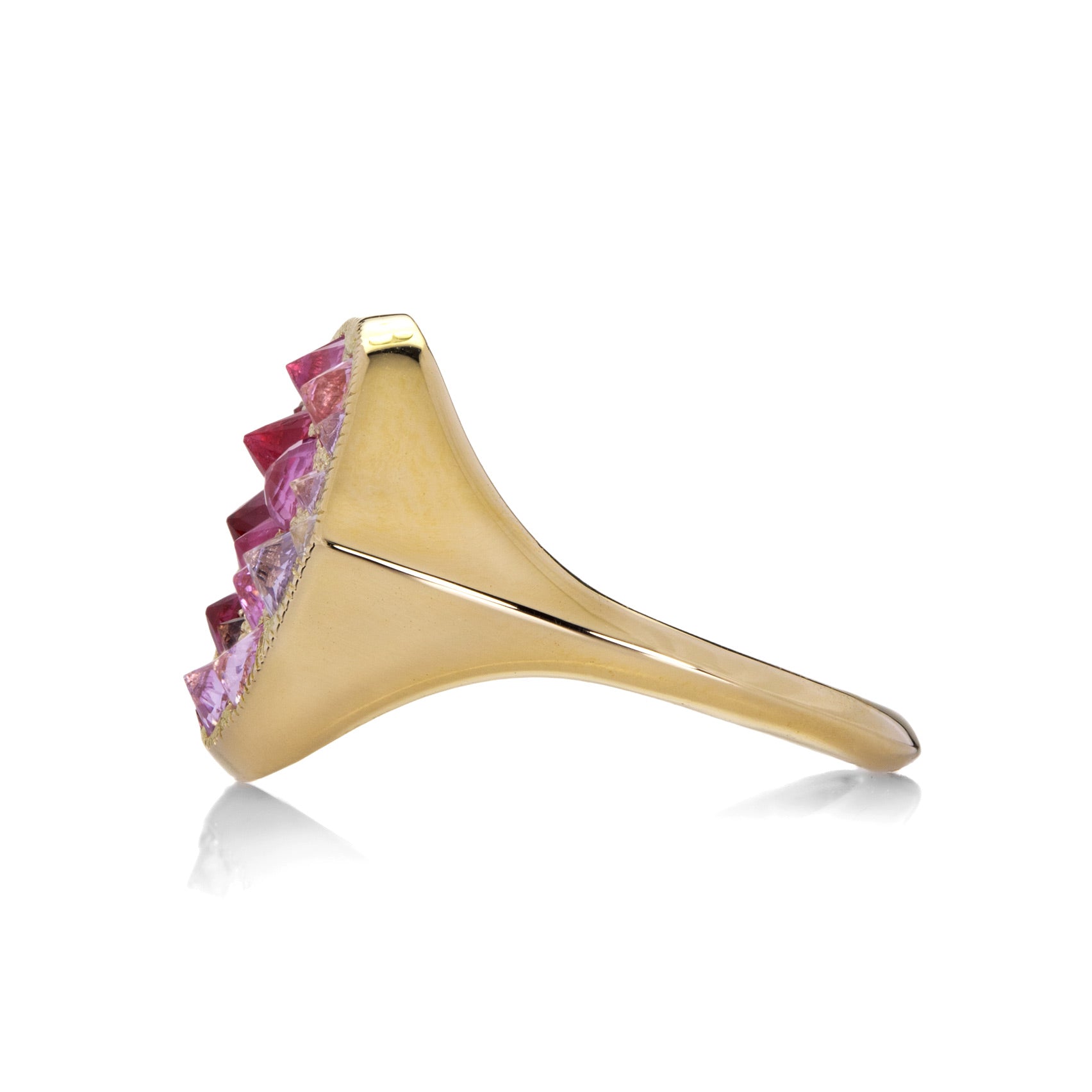 Follow your passions and let love light your way in this 18k yellow gold ring from Tamsin Rasor. The luxuriously textured face of the signet is paved with brilliant barbed sapphires and rubies totaling 1.53cttw. A sophisticated knife edge throughout gives this piece plenty of personality!Size 6.5. Handcrafted in New York, NY, U.S.