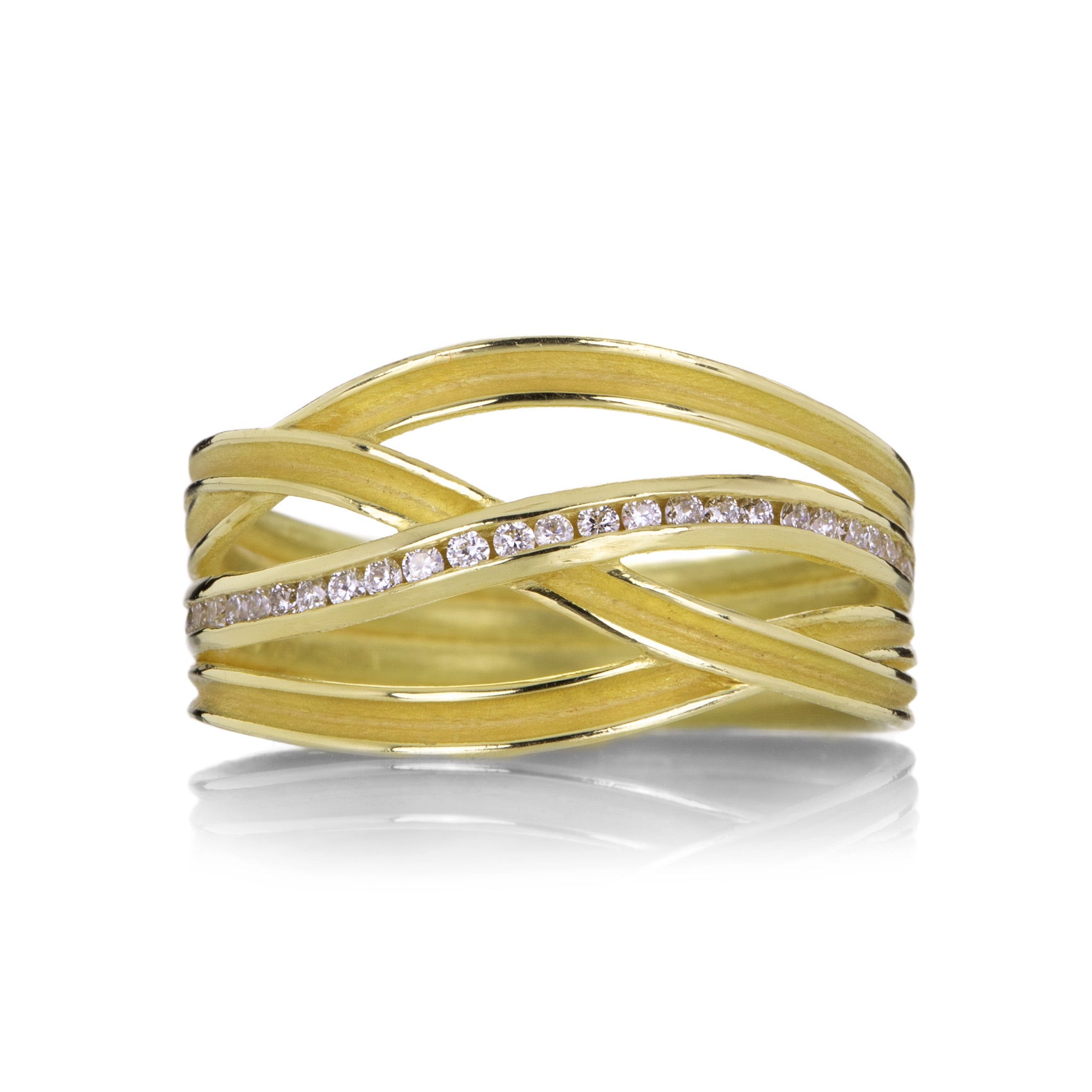 An instant classic, this 18k yellow gold ring from Barbara Heinrich ticks all the boxes for a fabulous right hand showpiece. Four flowing ribbons wrap gracefully around the finger with sumptuous texture and glow. A row of channel set white diamonds totaling 0.19cttw runs through one of the ribbons for that dash of fiery sparkle. Size 7.5. Handcrafted in Rochester, NY, U.S.