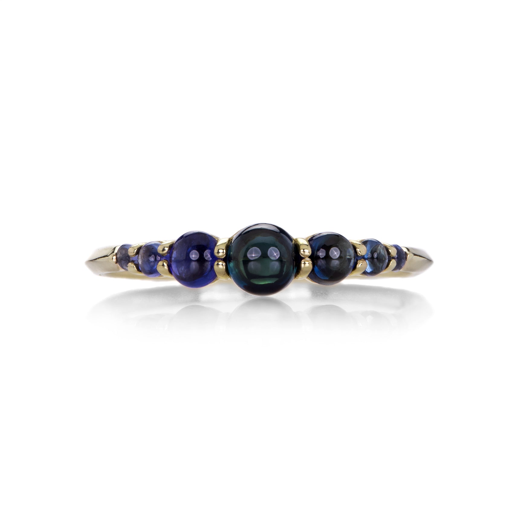 Wear a little sugar and spice up your day in this 14k yellow gold ring from Tamsin Rasor! A dramatic array of blue sapphire cabochons totaling 1.07cttw are snugly set across the face. Knife edge band is slightly tapered. Size 6.75. Handcrafted in New York, NY, U.S.